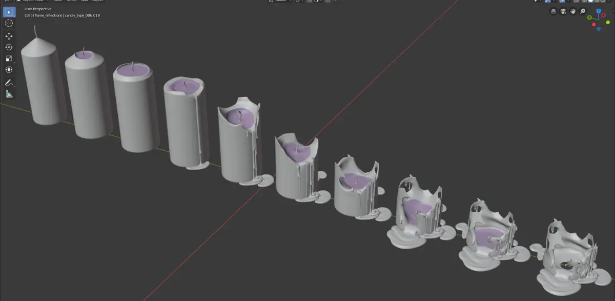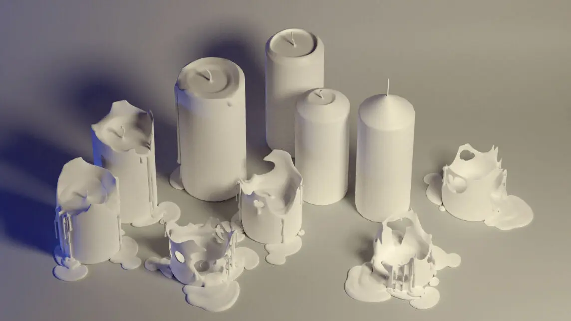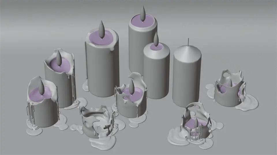 __Pool of melted material object on each burning stage included, with uv and material (blender only) for gradient transparency effect towards the margins. body of each candle stage also has basic candle material (still, in blender only) as well. wick object is unique to each stage too.