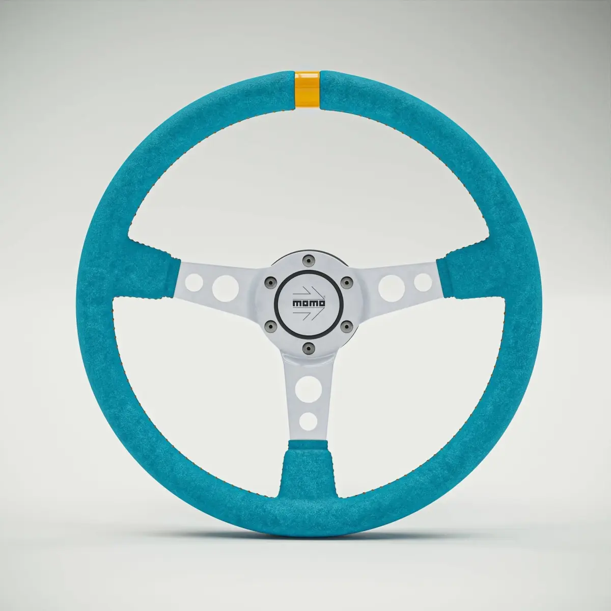 White steel steering wheel with cyan alcantara and orange stitching and black logo