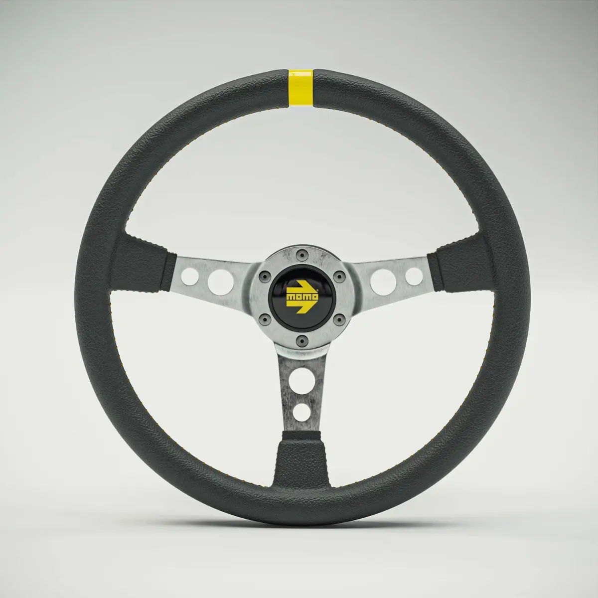 steel steering wheel with black leather grip and yellow stitching