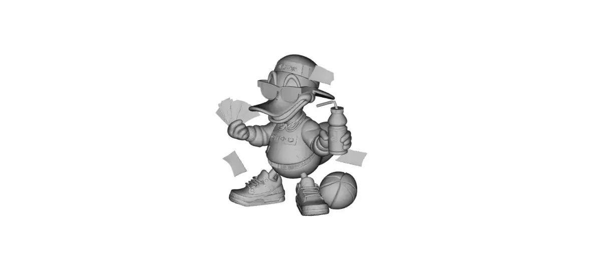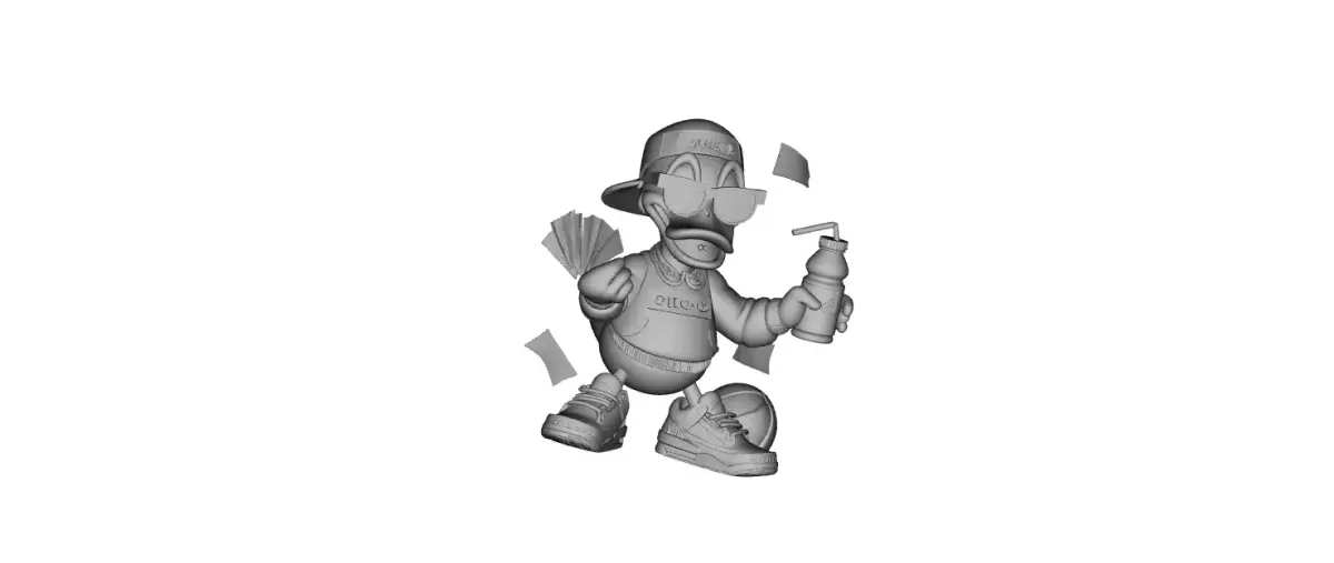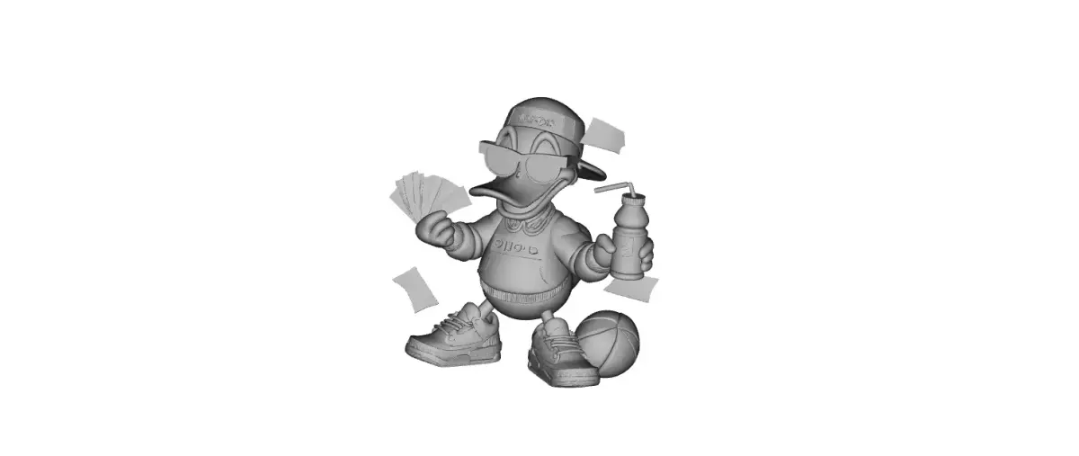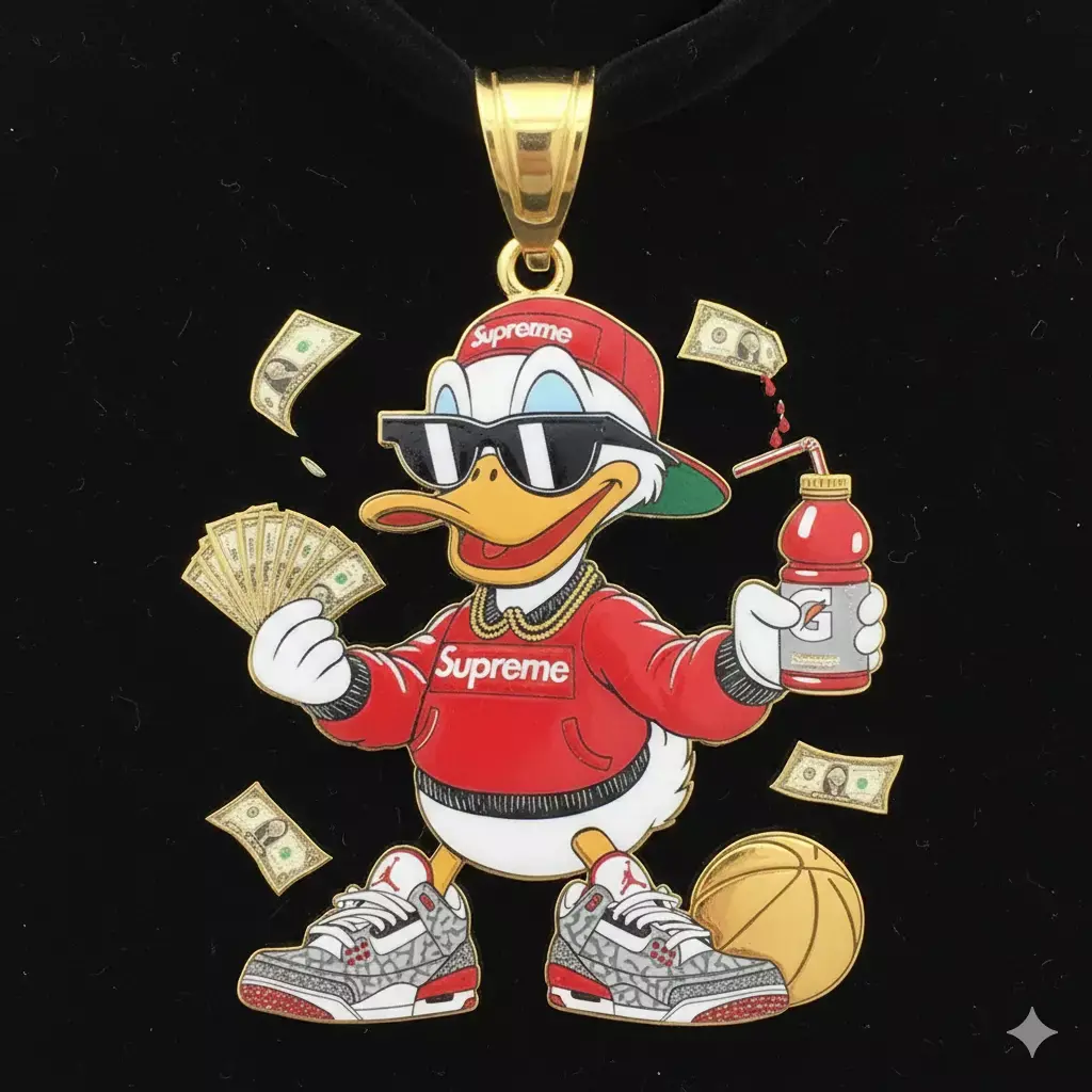 This street style cartoon duck pendant is an original 3D jewelry model designed by me with a bold urban attitude and strong character expression. The design features a confident duck figure wearing casual streetwear, holding accessories that symbolize success, energy, and modern culture. I focused on clean lines, smooth surfaces, and balanced proportions to keep the design visually striking while remaining suitable for jewelry production.