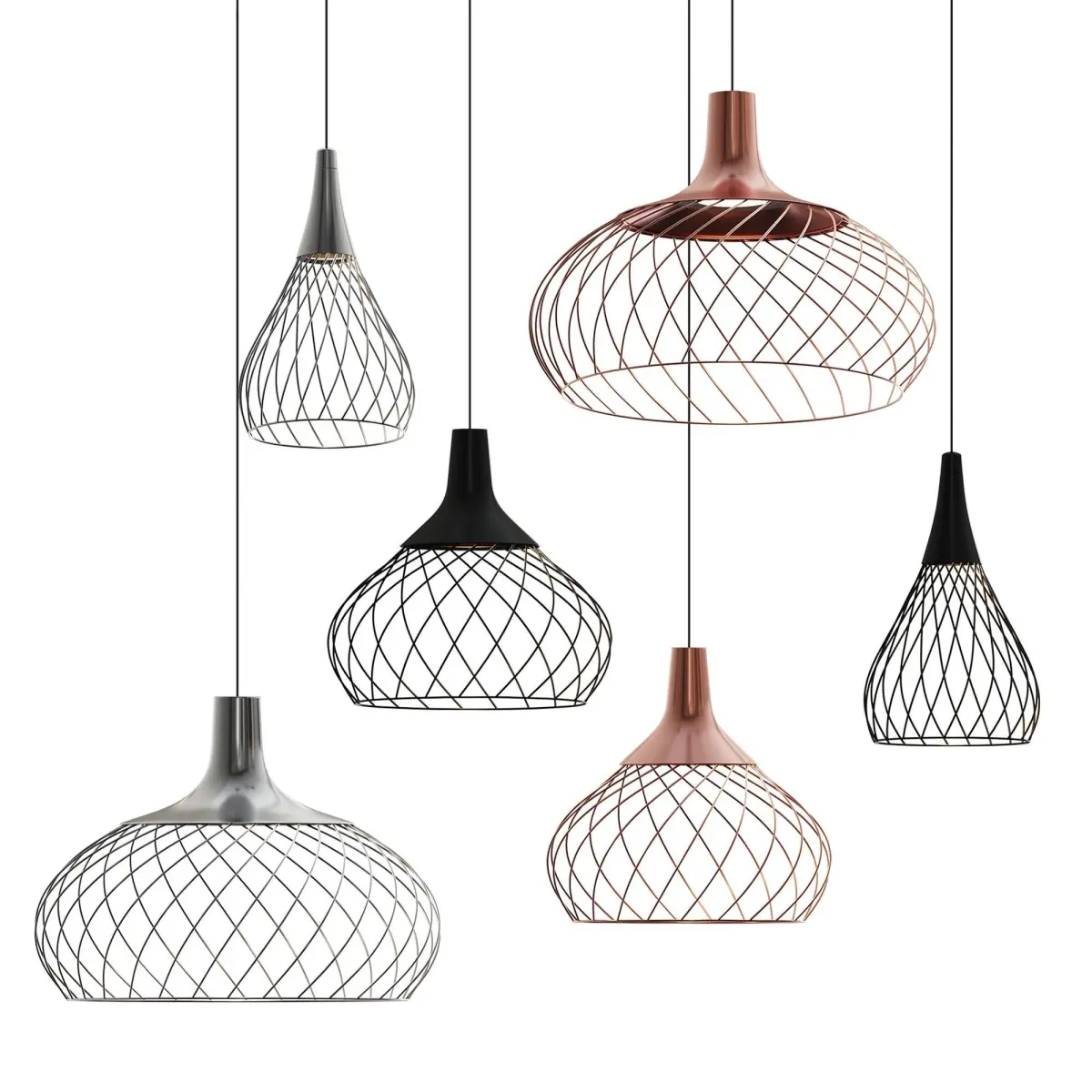 Organic self-packaging structure of two forms: one is more open and airy, the other is streamlined. A name that evokes visual lightness. Suitable in lacquered iron with copper or black finish. Designed to light up a dining table or living room, its vintage memories are perfect for creating the right atmosphere in a restaurant or bistro.