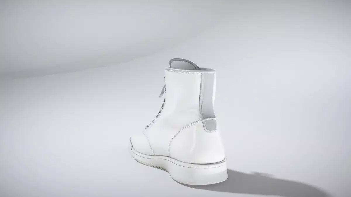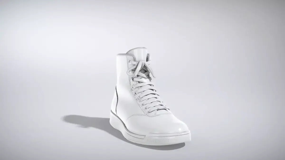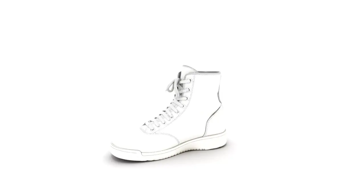 This boxing shoe features a tall, lightweight lace-up upper for optimal ankle support, crafted from durable synthetic materials in a sleek monochrome finish. The thin, flexible sole enhances agility and footwork in the ring. Each model has 3 levels of detail with QUAD polygons: