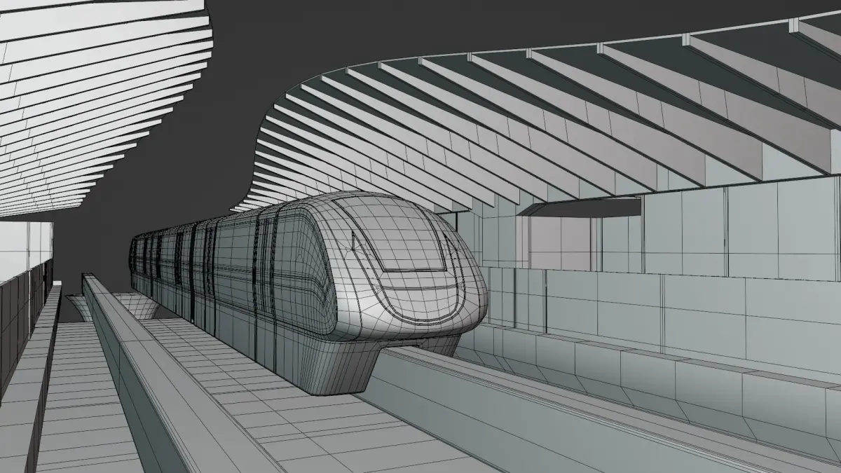 - This is 3D model of fictional railway station with monorail train.