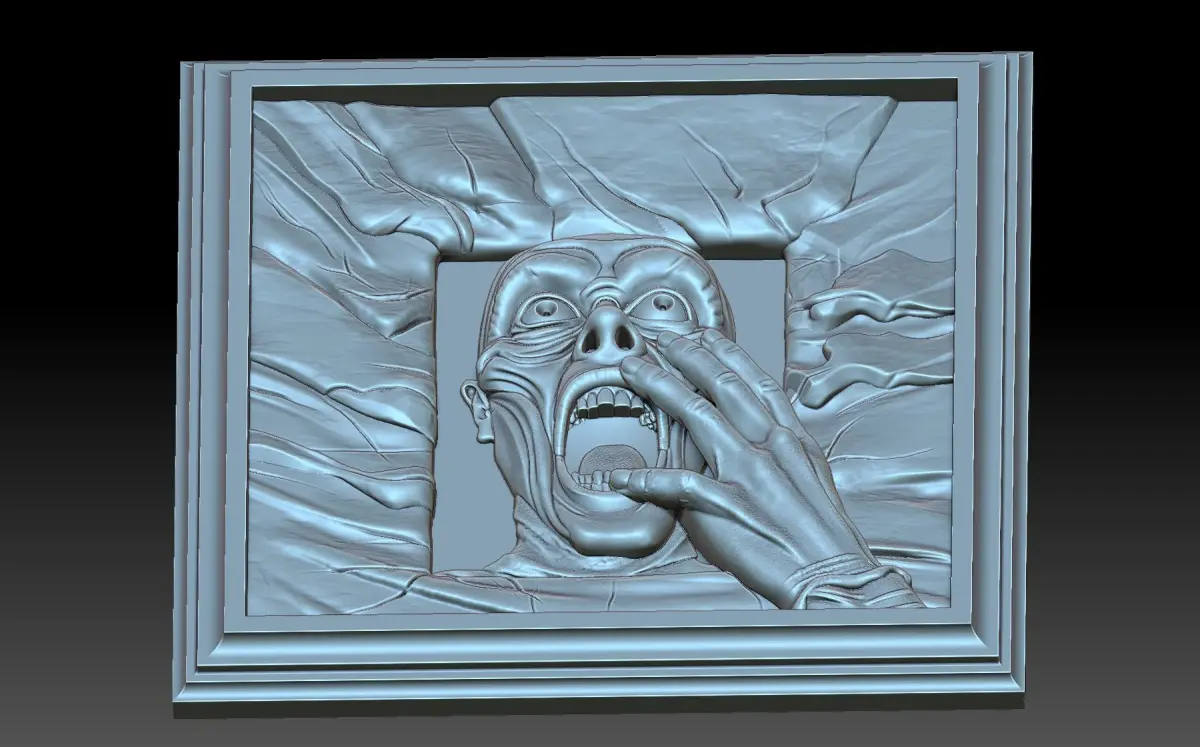 A 3D model of a bas-relief depicting a face depicting fear. The work shows emotion well - fear, horror. Suitable for 3d printer and CNC machine.