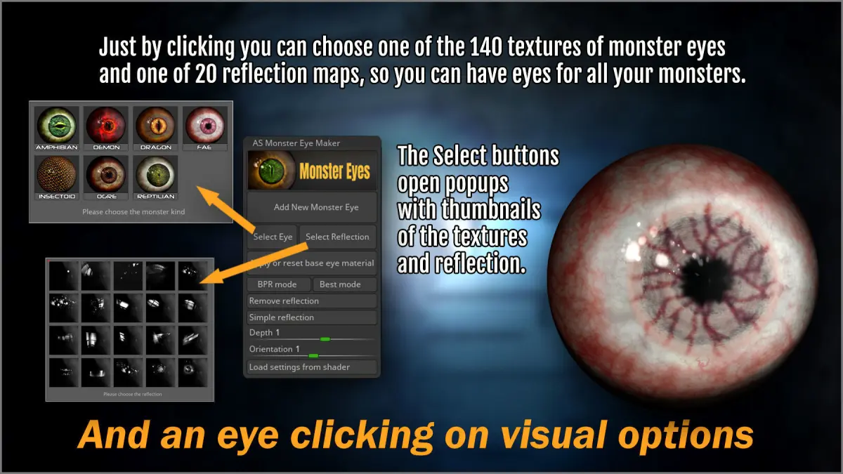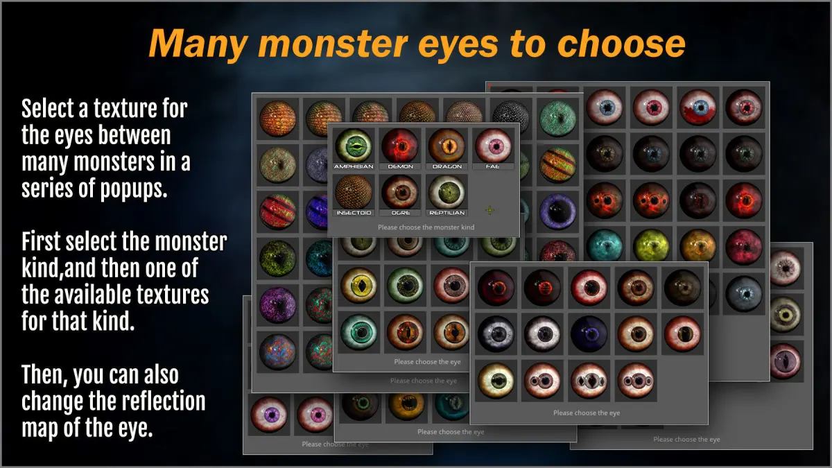 Monster Eye Maker is a fast way of adding eyes to your monsters, fantasy creatures, sci-fi characters, and night breeds. Includes 140 textures for many kinds of monsters, and a plugin for quickly adding them that also allows you to select the texture and reflection map for the eyes in a visual way.