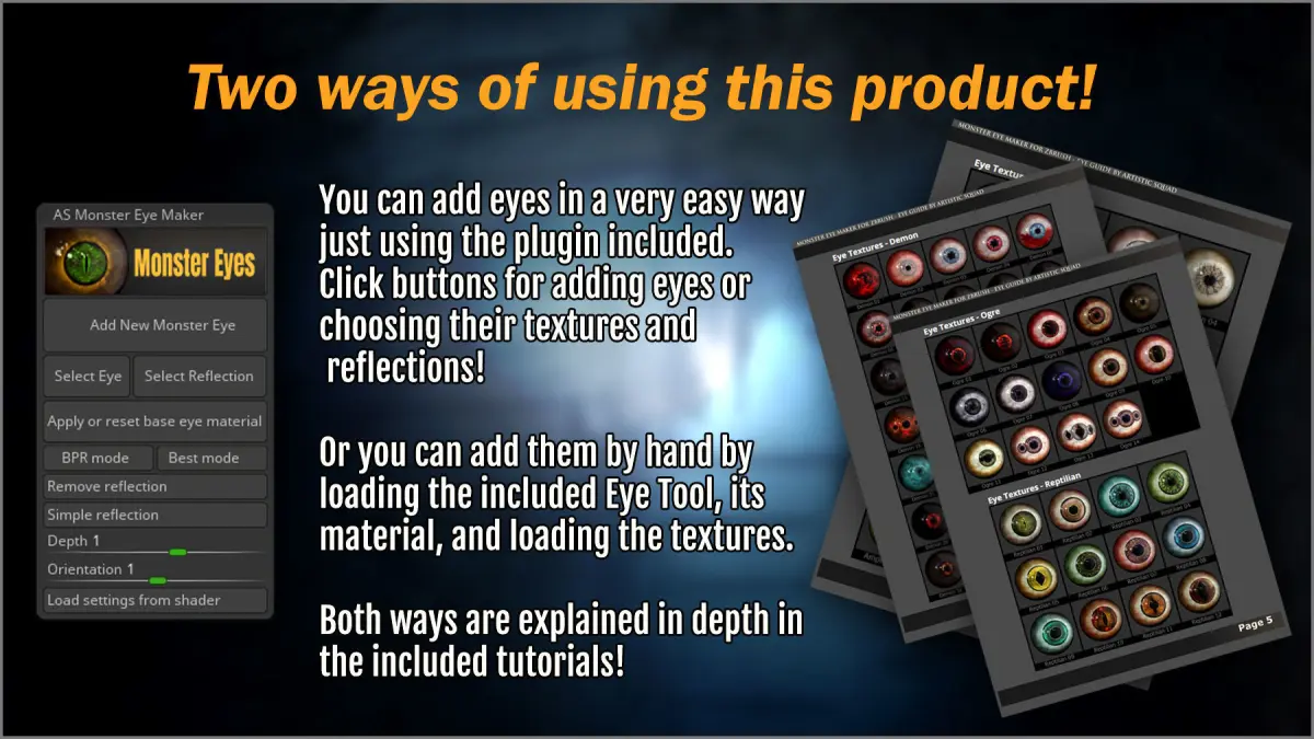 Automatic: install the included plugin and start adding eyes quick and easy.Manual: use the textures, tool, reflections, and material and add them yourself.The easier and faster way is to use the included AS Monster Eye Maker Plugin inside ZBrush. It will allow you to add eyes in a moment to any model.