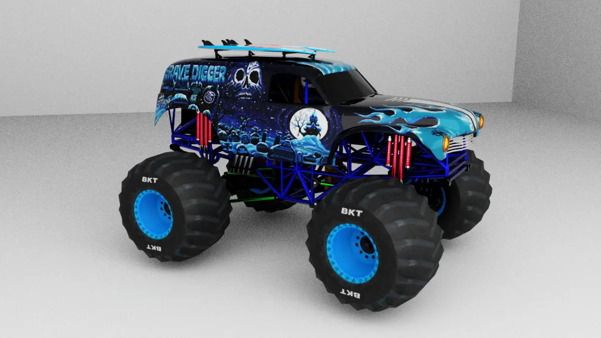 Monster Truck Gravedigger is around 32k polygons with tires, interior and driver.