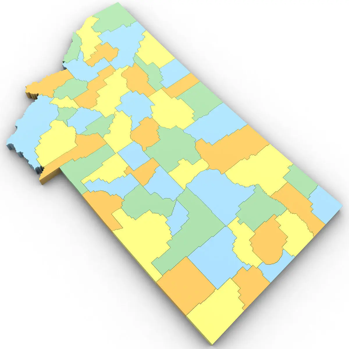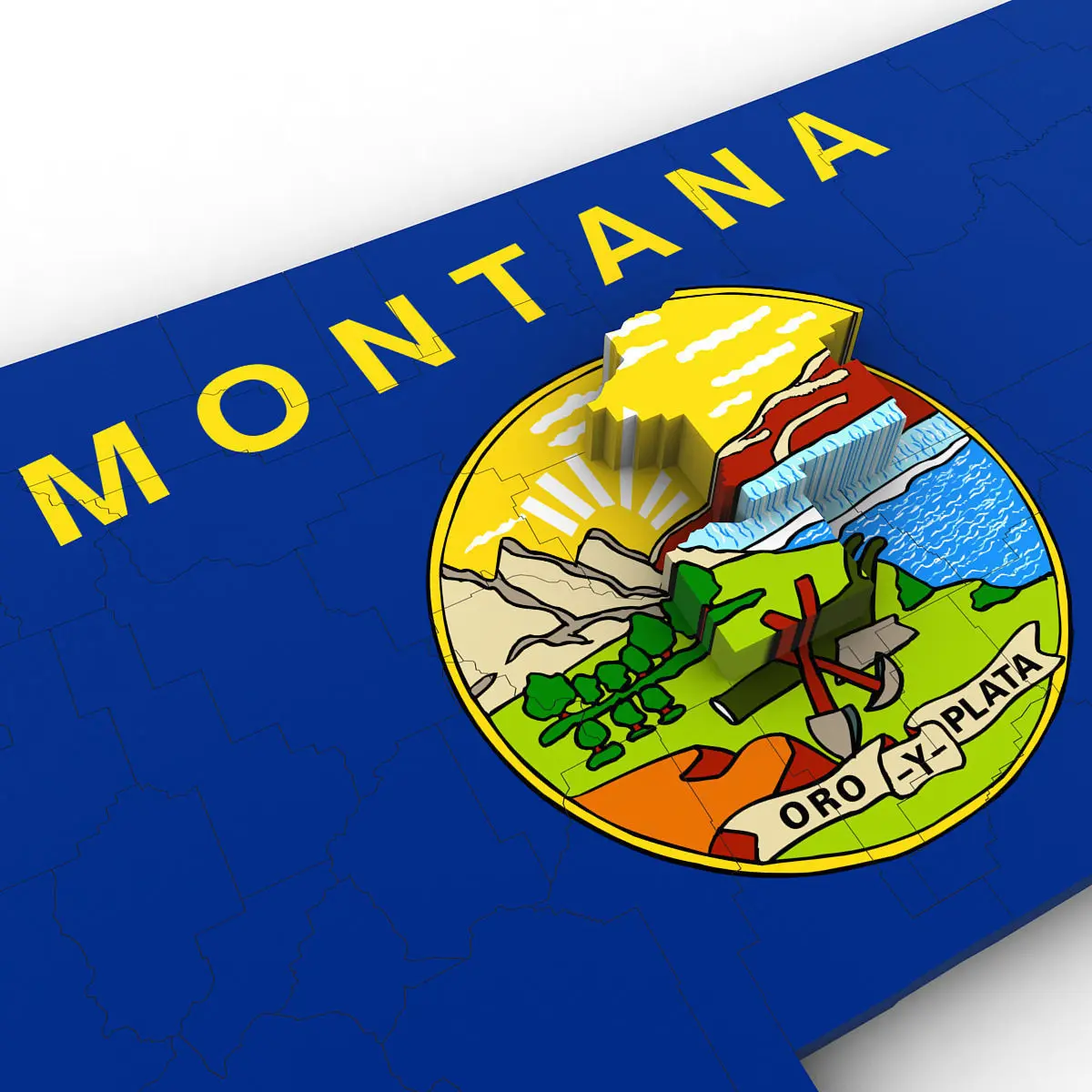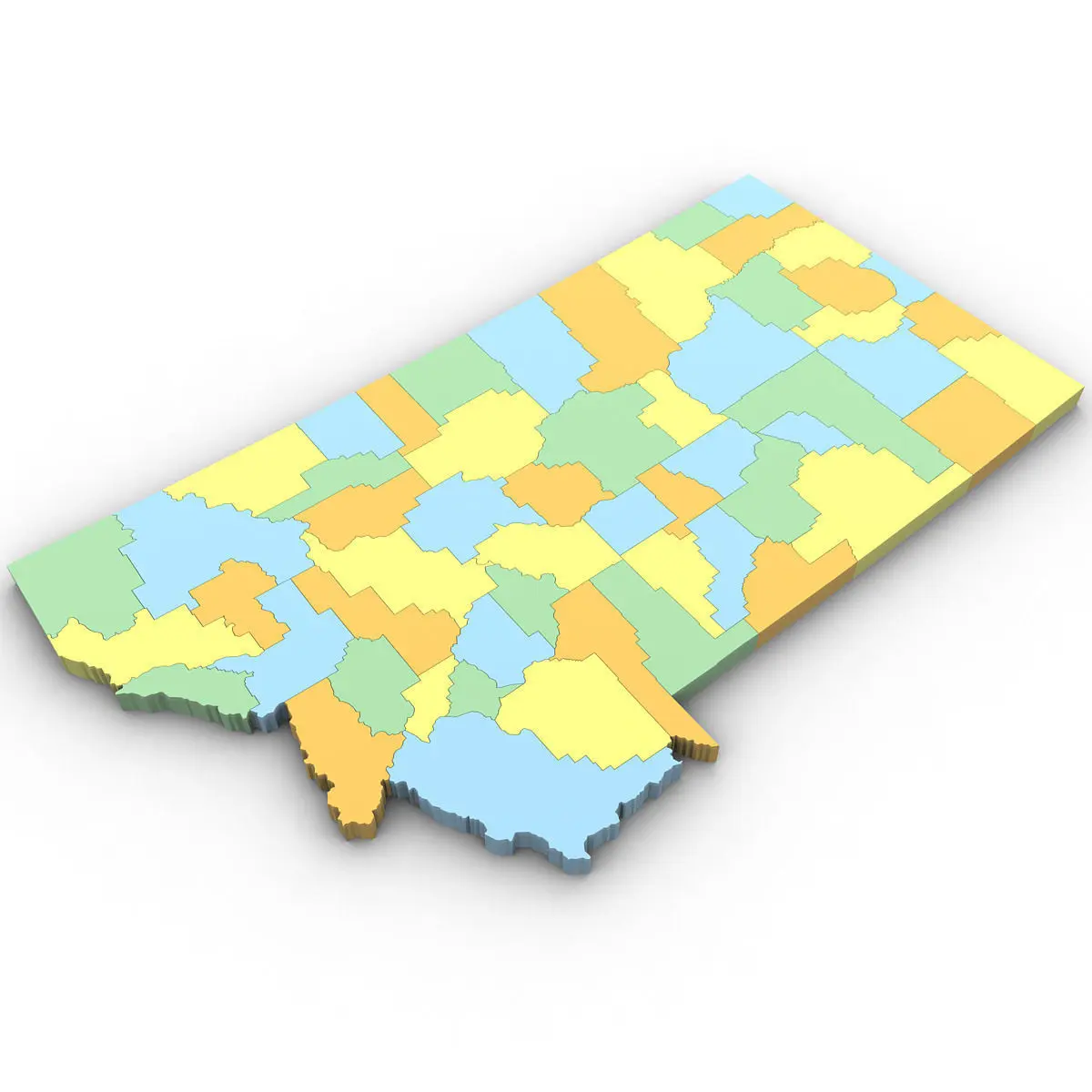 3d Model of the Political Map of Montana. Features every county in the state. The modifier stack is uncollapsed allowing for easy change of extrusion settings.