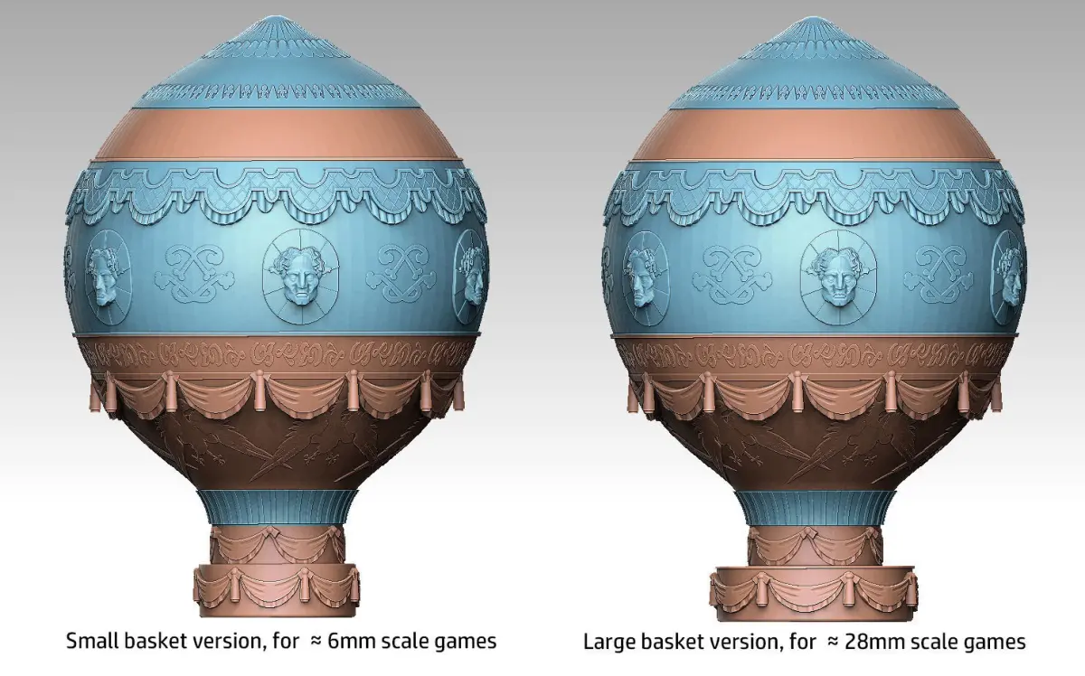The model pack includes two slightly different versions of the balloon. One has a slightly enlarged basket, so that you can place figurines inside it. The other has a smaller, solid basket so that you can print the balloon at a smaller scale without it becoming structurally unsound. Recommended printing scale for version 1 is 15mm scale and upwards. Recommended scale for version 2 is anything from 6mm and upwards. Note that proportionally, the solid-basket version is closer to most historical depictions of the Montgolfier balloon than the enlarged-basket version is.