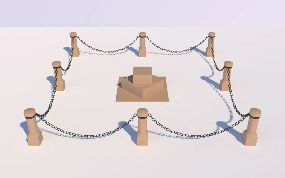 Made with Blender. If you open the blend file you can easily set up the number of pillars and chains elements. Subdivision surface for chains. Simetrical modifiers.