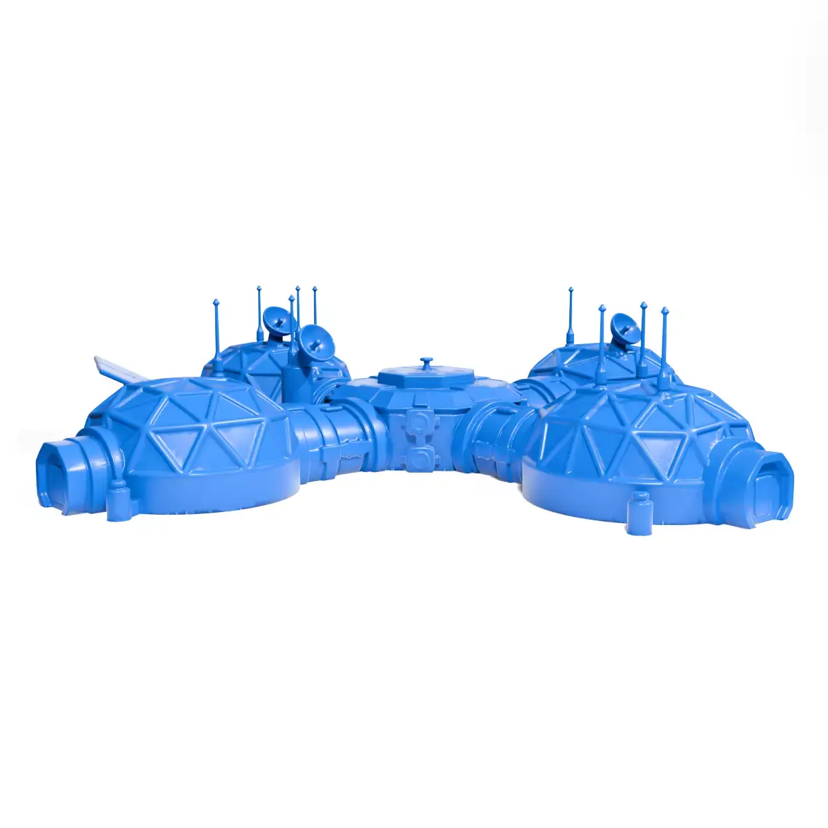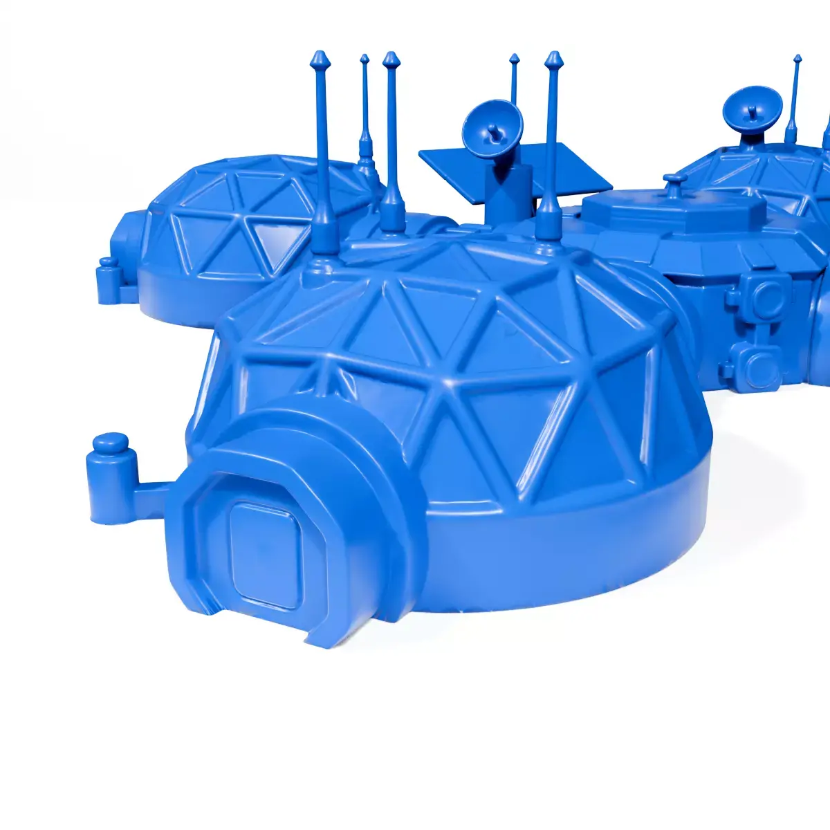 The Moon base model is an imaginative representation of a futuristic lunar colony featuring interconnected domes with geometric designs.