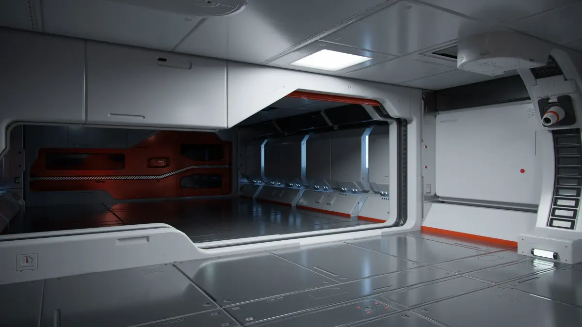 An environment of a moon base's body scan room for MRT scans. Native Blender files provided with camera, lighting and render set-ups. The scene uses a trim texture to provide hard surface details. Tiling grunge textures are used to add roughness detail to the meshes. Colors can be easily changed. The separate parts are modular and can be snapped on the grid to increase the size of the environment.