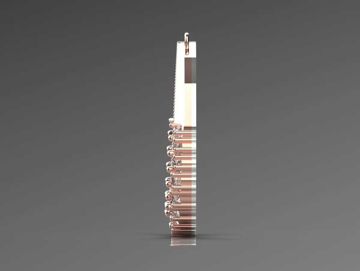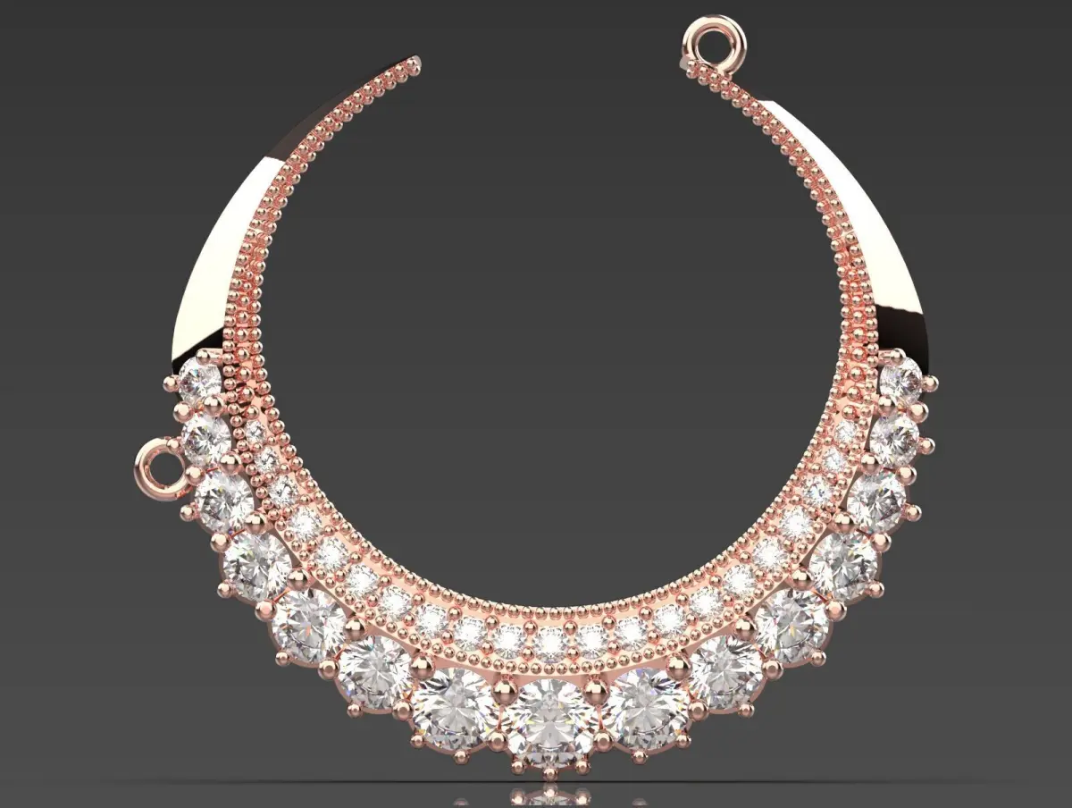This image shows a stunning piece of jewelry, a necklace or a decorative pendant, designed in a semicircle or crescent shape. The jewelry is rose gold plated and adorned with several clear, sparkling gemstones or diamonds arranged in a symmetrical pattern. The gemstones are arranged along a curve, with larger stones in the lower center and gradually smaller stones toward the ends, creating a luxurious and elegant look. The piece has small loops or links on both ends, suggesting that it may be part of a wearable necklace or chain. The background is a dark, neutral color that highlights the brilliance and shine of the jewelry.