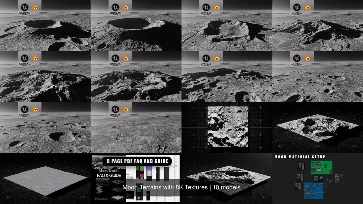 Optimized 3D Models of Moon Landscapes ready for Cinematics, Animations, and Games. This asset is native to Blender and Unreal Engine 5. This asset is based on a 5000x5000 km area but can be scaled to fit your needs and is meant for Kitbashing ! By combing all the assets in this pack you can easily and quickly create large Moon environments for your scenes. These objects are meant for medium to far viewing and as background elements.