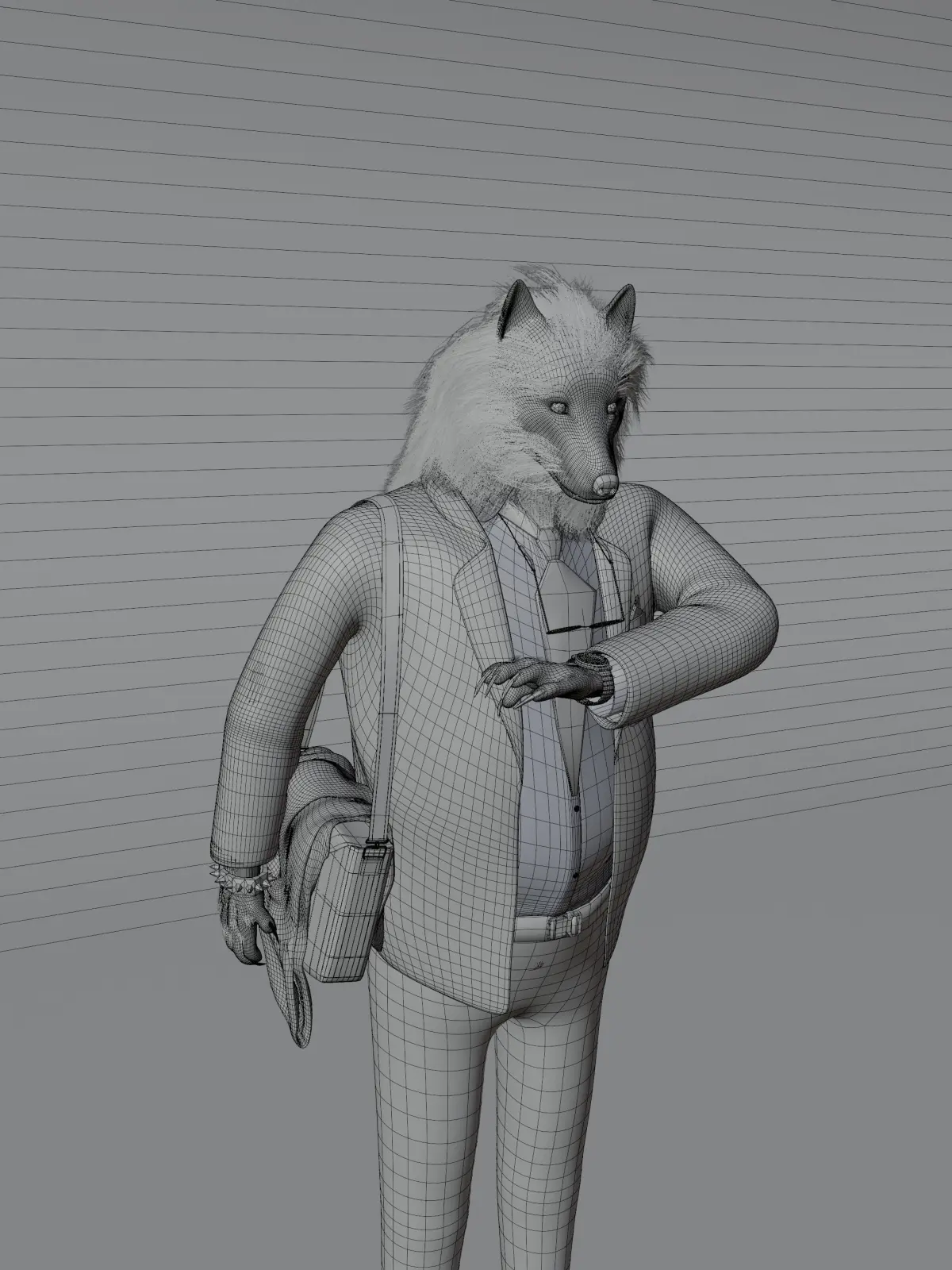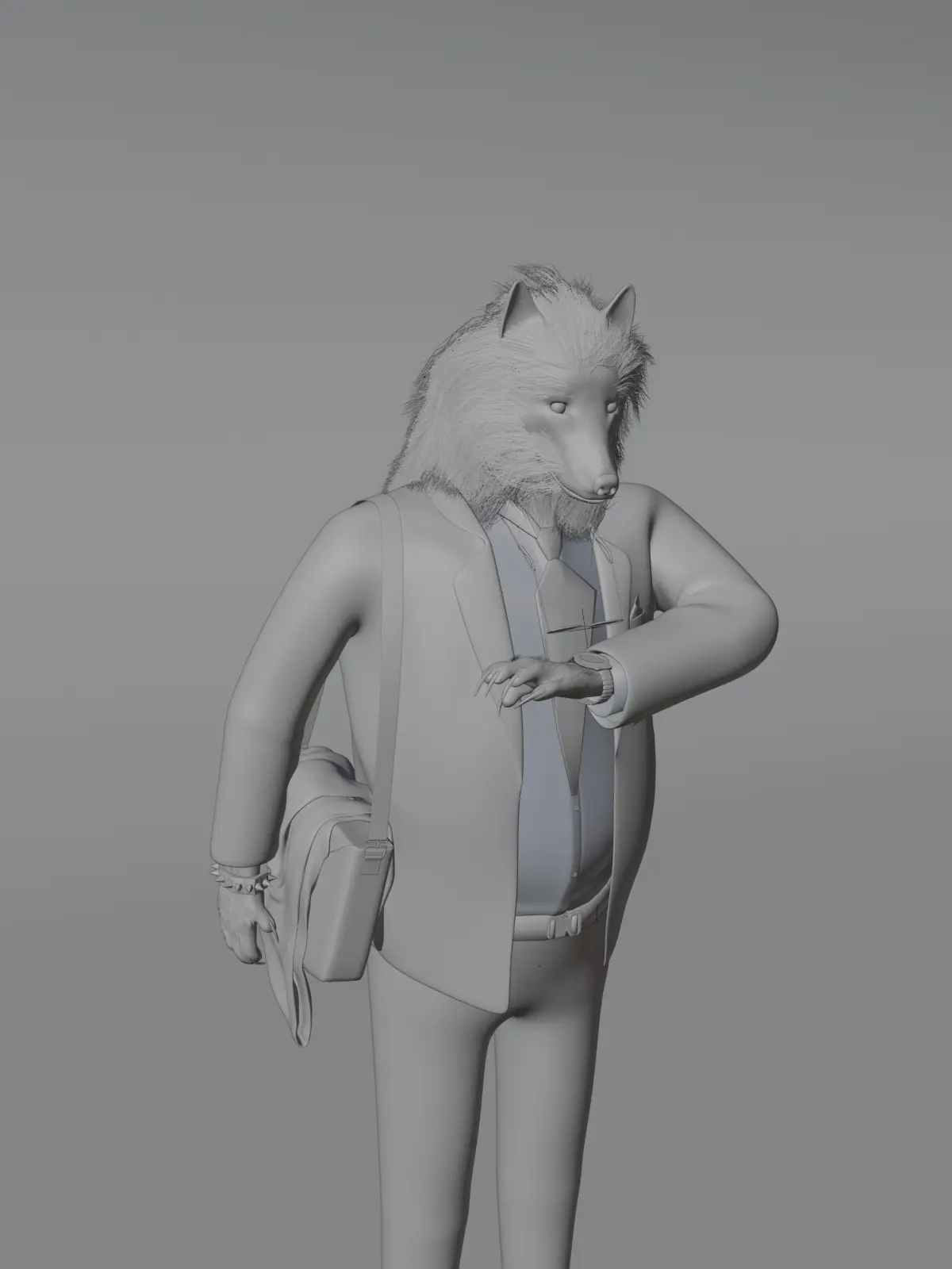 MoonA is not just a stylized 3D character — it’s a commentary on the duality of modern identity. This anthropomorphic wolf, dressed in formal business attire and checking his watch with composed precision, appears as any ordinary corporate employee at first glance. But subtle visual cues invite the viewer to question the surface.Beneath the tailored suit lies something more primal.With sharpened claws he never hides, torn remnants of a red hoodie slung under his arm, and faint traces of a crimson stain that couldn’t quite be washed away — MoonA retains the echoes of his past, his instincts, and his true nature. The hoodie’s distressed fabric and unnatural red hints serve as metaphorical remnants of a suppressed beast — or perhaps, a beast transformed.This model plays with contrast: order vs chaos, civility vs instinct, man vs animal. Is he hiding from his wild nature, or merely disguising it? Is the corporate environment a place of order, or just a different kind of wilderness?MoonA is both a stylized creature and a cultural reflection — a perfect character for concept art, storytelling projects, animation, or as a symbolic figure in digital illustration.