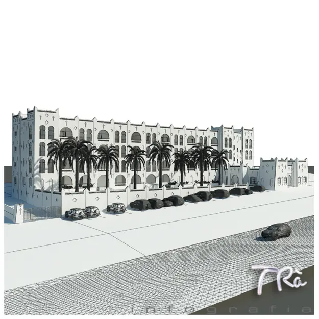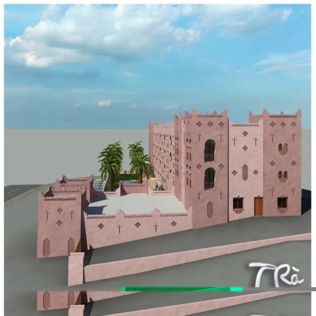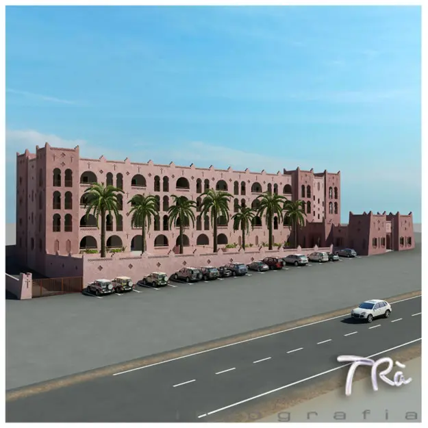Detailed exterior model of arab hotel, modeled with Max 8 and Vray materials. Includes materials and maps.