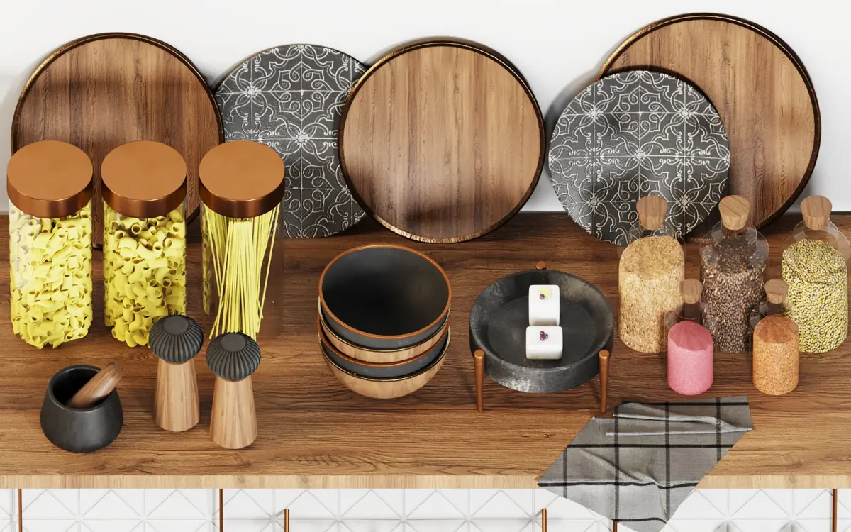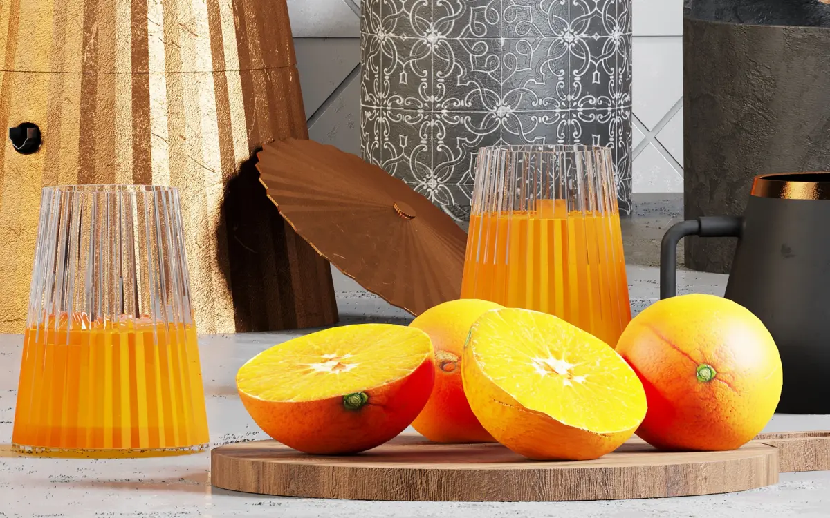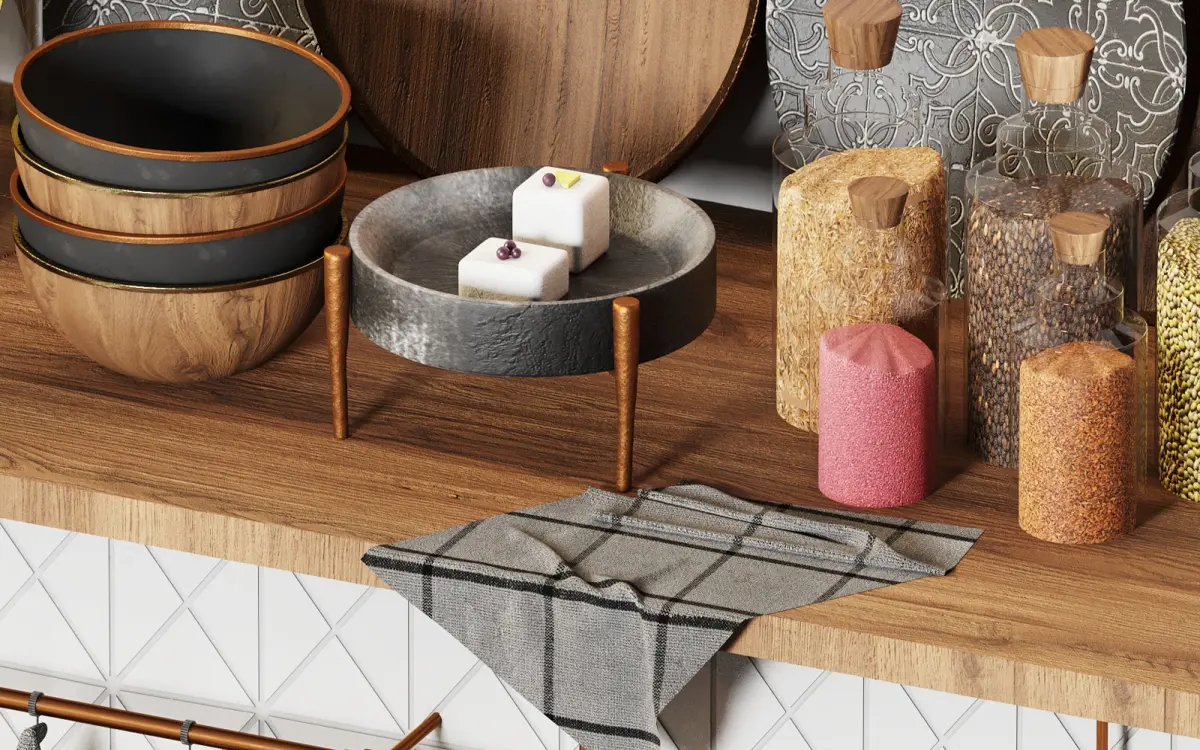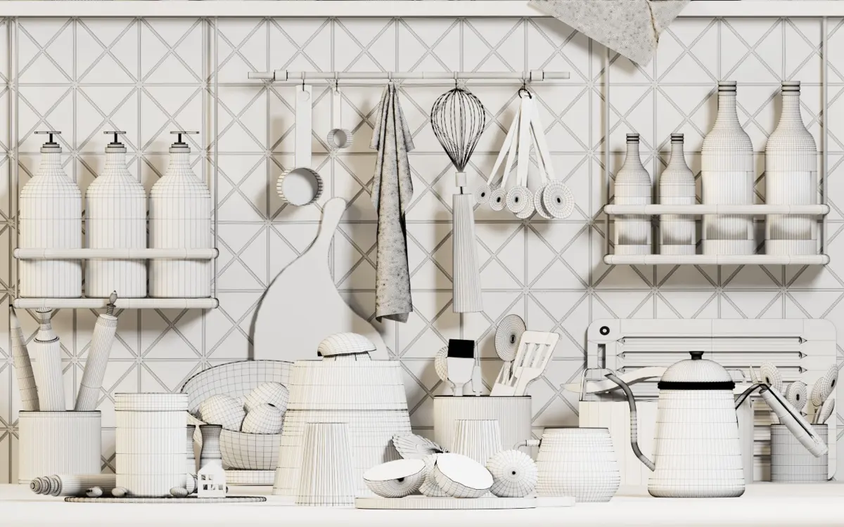 This project includes a shelf in top of the ground and some products of alessi and morso brands. bottles and glasses of oil,salt and pepper are in this project.orange and pistachino are the fruits in this scene.I hope you enjoy the colors, materials and models.