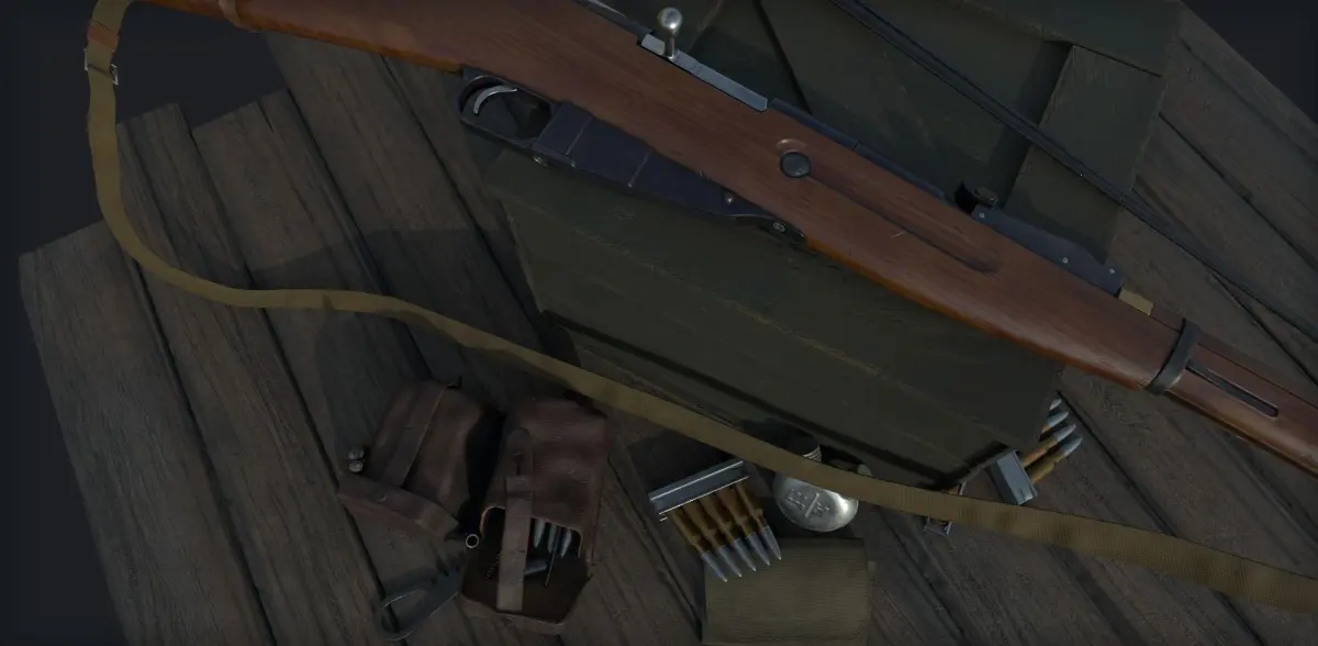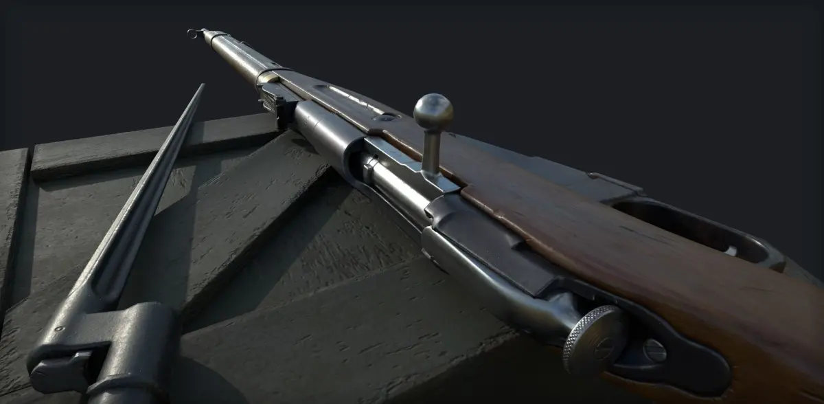 The asset includes an ammo pouch, bullets, and a bayonet, as well as the standard cleaning and repair tools each rifleman carried. The included LOD1 model comes in at around 9,000 triangles, all assets counted. Bolt, sight, bayonet are separate meshes for animation purposes.
