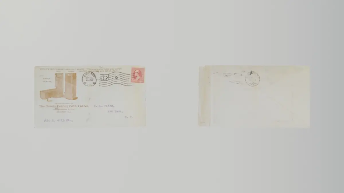 This is a model of a Mosley Folding Bathtub 1899 advertising envelope. Mosley folding bathtubs where manufactured from 1880 to 1900 as a way to bathe without having all the space needed for a traditional bathtub. They were advertised as A perfectly equipped bath and No Bathroom required. The mosley folding bathtub produced 20 styles of bathtubs over the years.