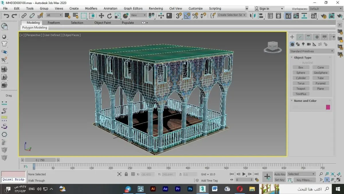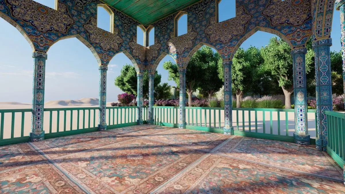 An oriental sitting in a mosque with arches of a decorated building that can be repeated by making it multi-storey and its repetition gives aesthetics to the scene