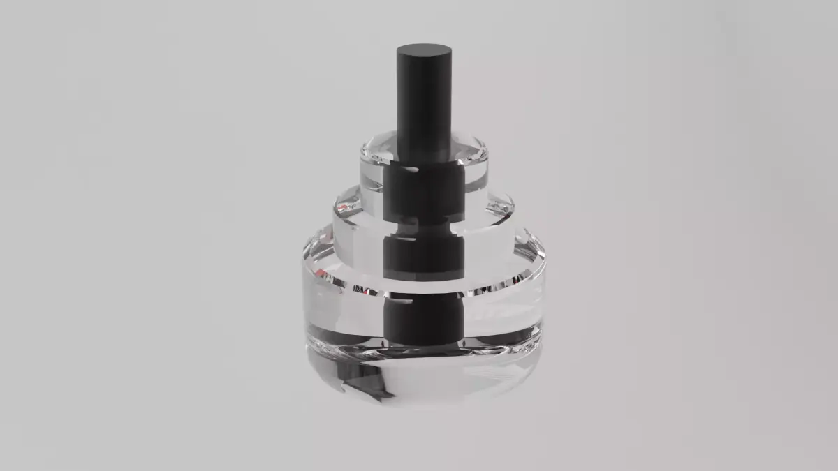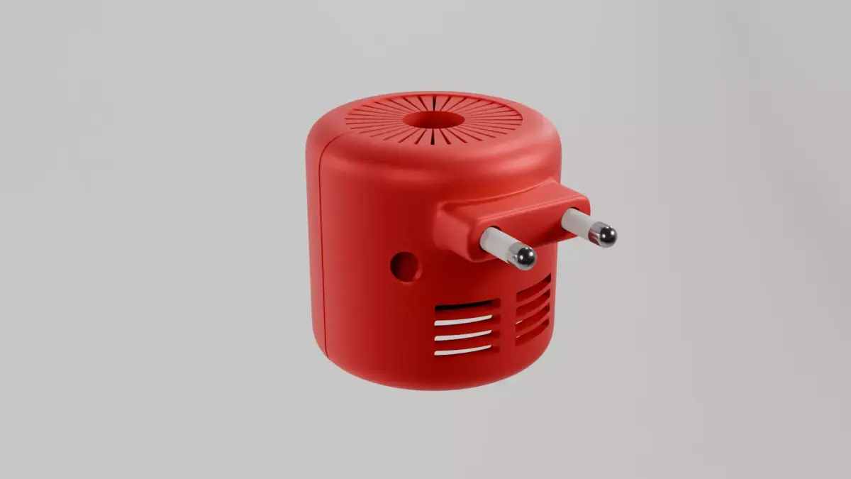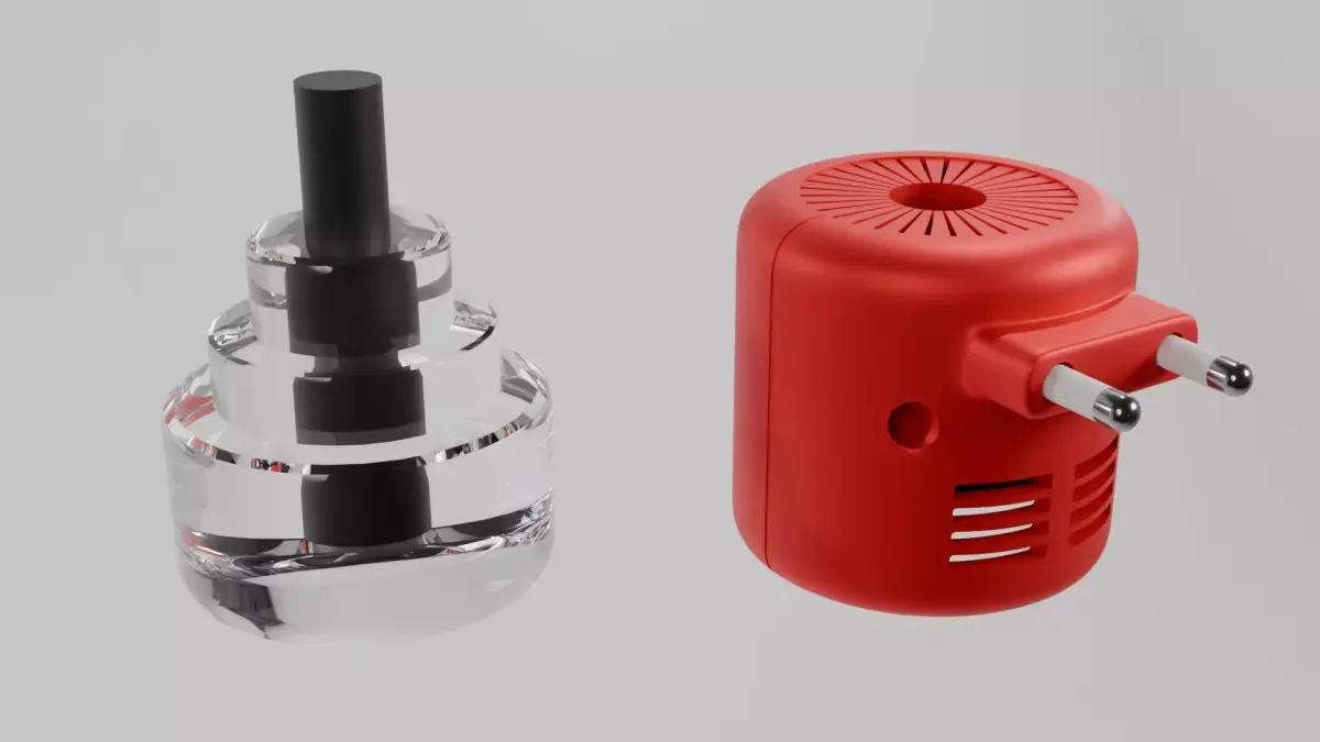 A compact plug-in liquid vaporizer mosquito repeller designed with a small refill bottle at the bottom and a vented plastic housing on top. The model typically includes a transparent or semi-transparent refill container, a screw-on cap with a wick, and an upper body with ventilation slits for vapor release. The plug portion extends at the back for power connection. Suitable for product visualization, packaging mockups, or interior scene detailing.