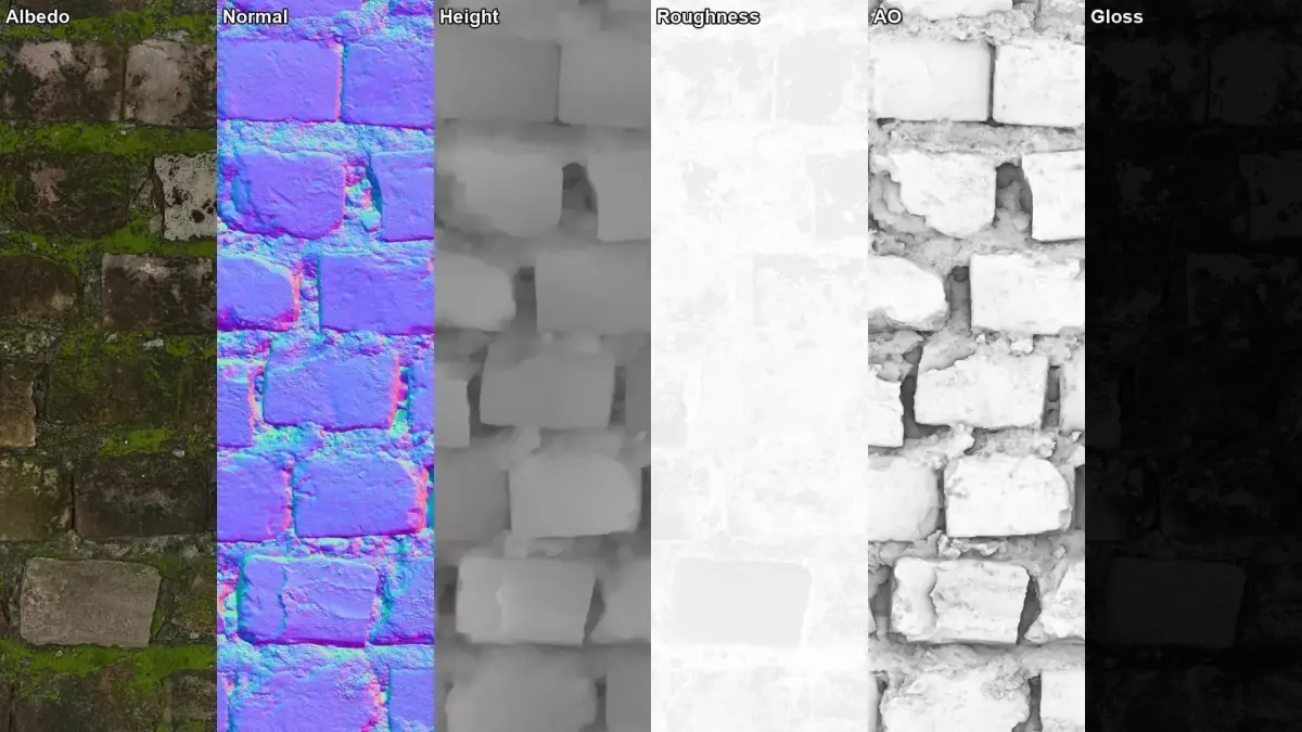 Maps: Albedo (lighting removed), AO, Glossiness, Roughness, Height, Normals
