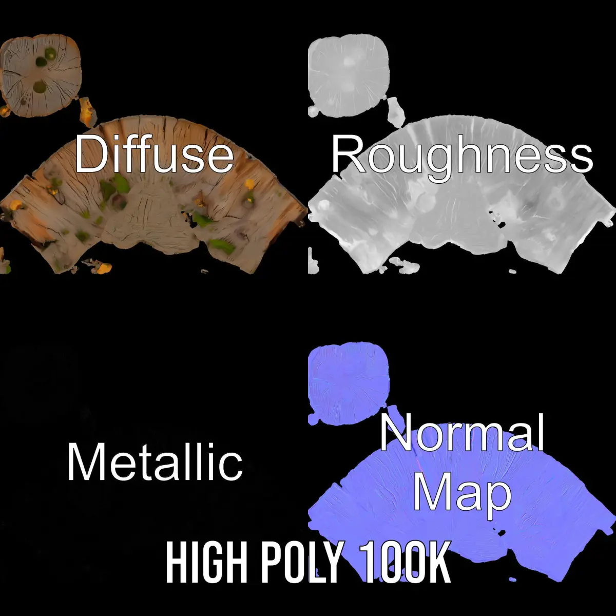 The Mossy Tree Stump with Fungi Model Pack features a detailed 3D model of a tree stump with realistic moss and fungi growth. Each model has 3 levels of detail: low-poly (1000 triangles for mobile), middle-poly (10,000 triangles for environment), and high-poly (100,000 triangles), allowing for use in production rendering, game engines, and interactive presentations. Ideal for forest scenes, fantasy landscapes, and nature documentaries. The model's textures include PBR, Diffuse, NormalMap, and reflection/roughness/metallic, suitable for modern rendering engines. All models are accurately unwrapped with no overlapping UVs. Textures are 4096*4096 in size. The first image is the reference used for creating the 3D model. It is important to carefully evaluate the quality of the model by examining the preview images that display the topology and polygonal mesh. These previews (WIRE and WEB 3D Preview) clearly demonstrate how accurately the model matches the original reference and how well the geometry has been executed. Please like and leave a comment if you enjoyed the model.