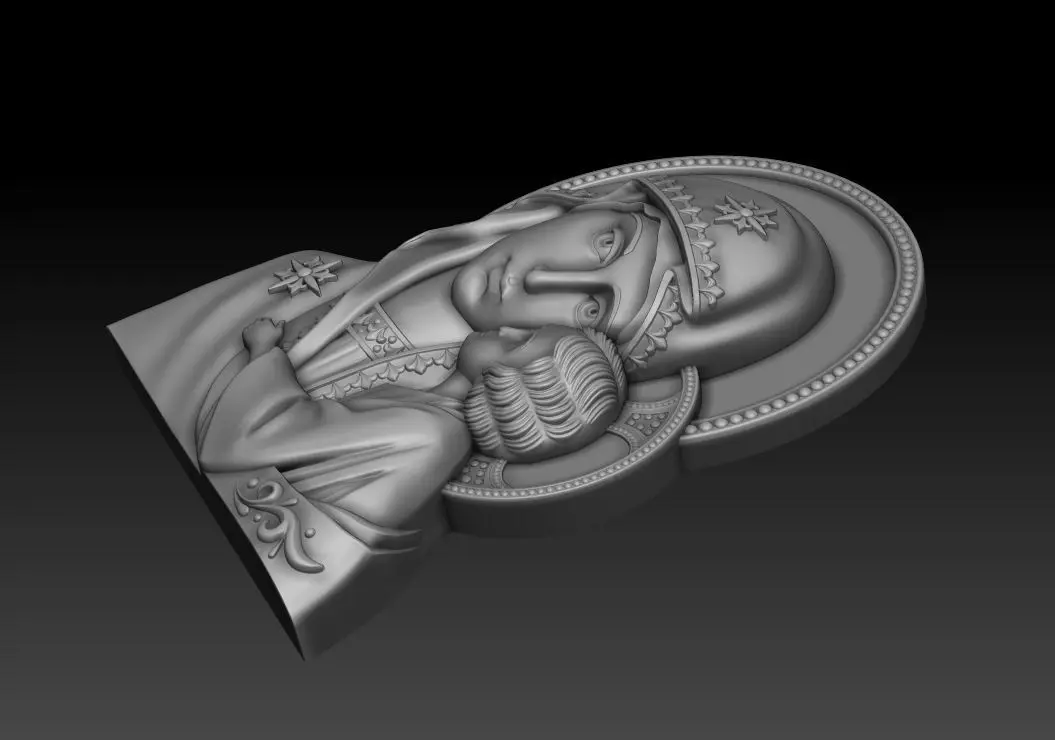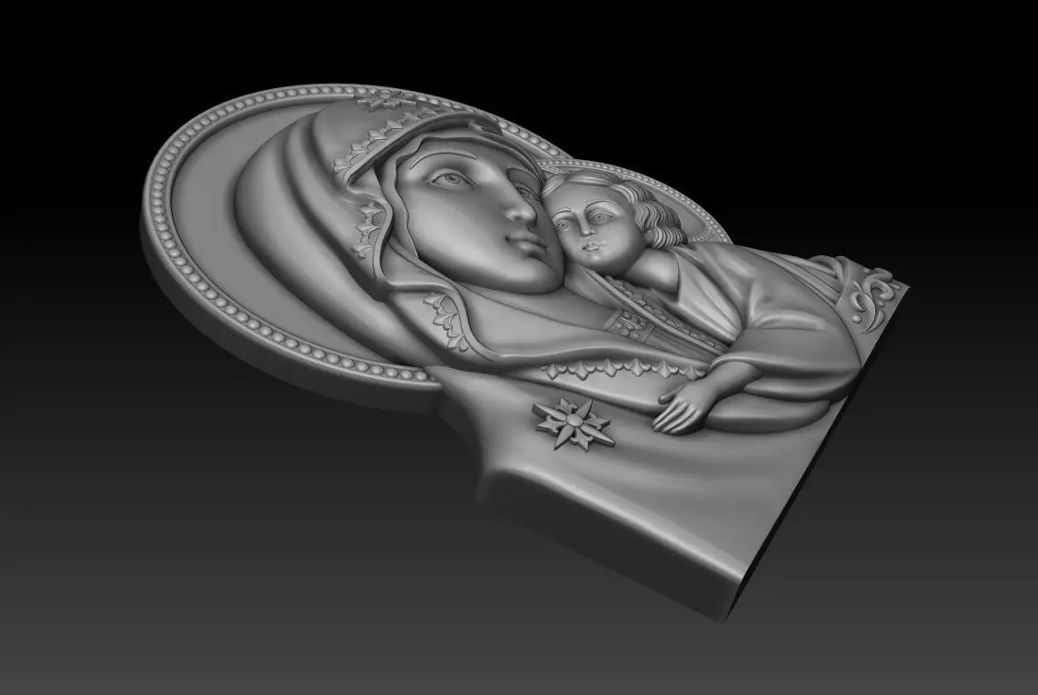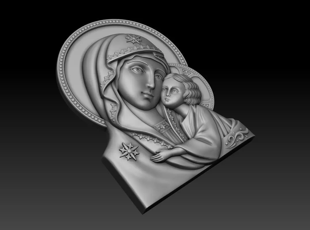3d model Orthodox icon of Mother of god with child. For milling on CNC machines or 3d printing. Can be used in the production of souvenirs, furniture, jewelry. Files in stl format, for import to artcam, rhinoceros, 3ds max, etc. You can scale the model to any size you need.
