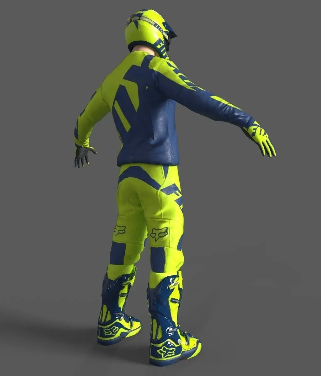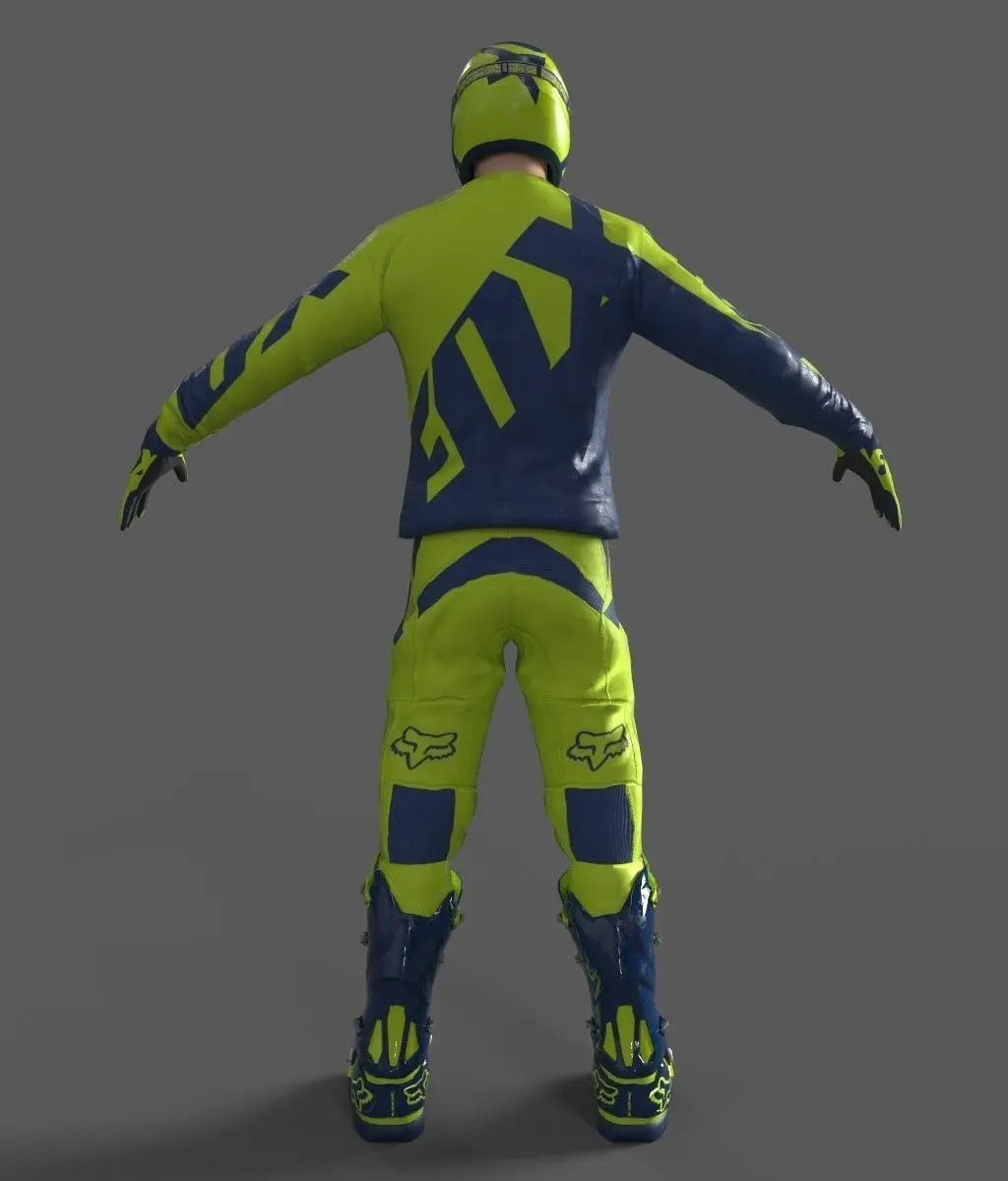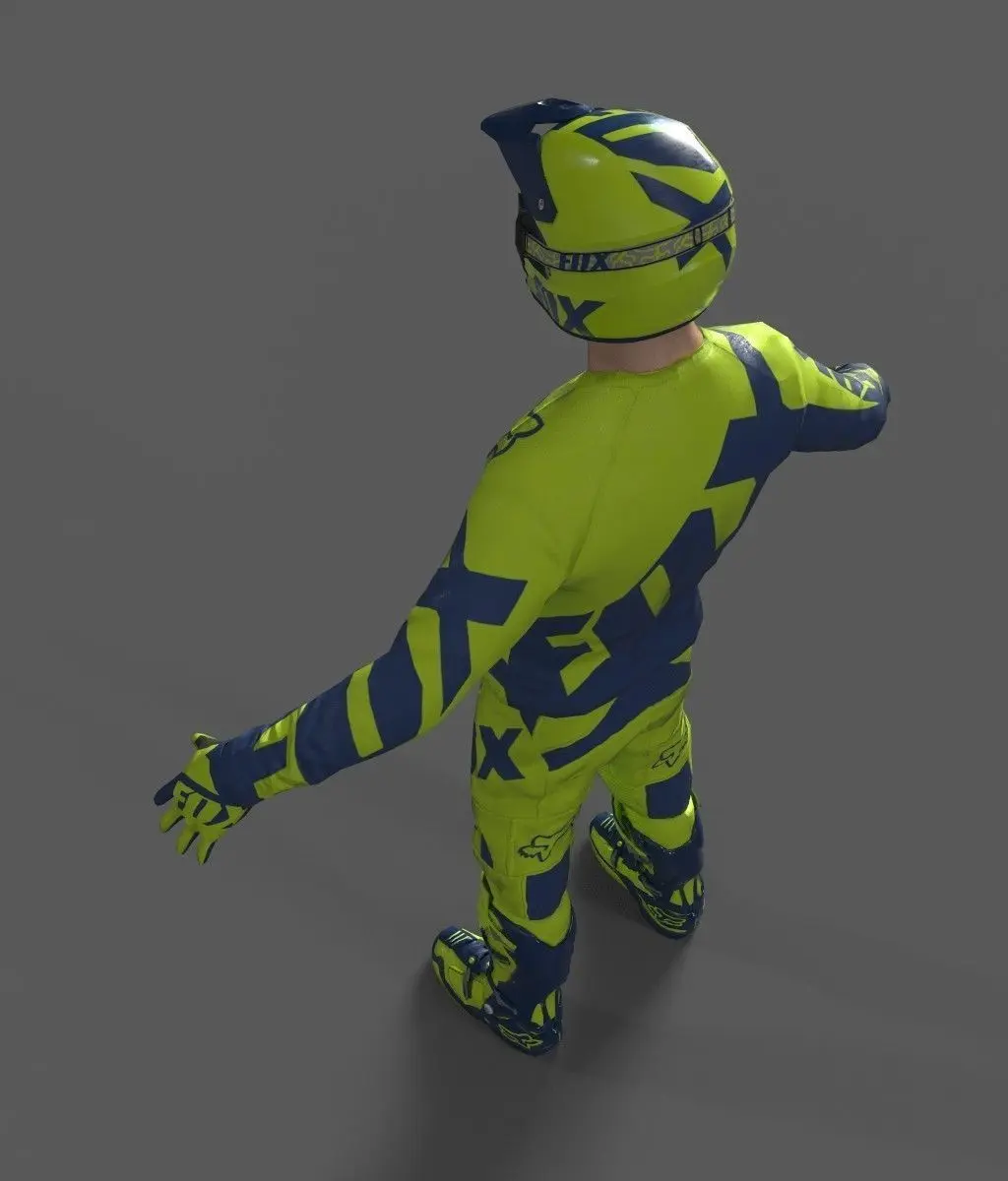 3d model of motocross racing suit- All colors can be easily modified with .psd format.- All textures and materials are included and mapped in every format.- No plugin needed to open scene.