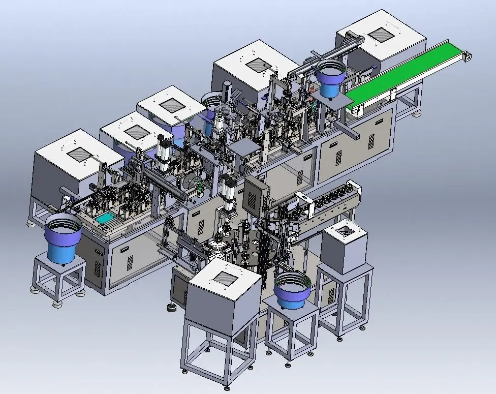 Motor automatic assembly production line 3D model. This complete set of non-standard equipment drawings is designed with SolidWorks 2012. Its main function is to assemble all motors and parts and finally realize unmanned operation when the finished product is discharged. The internal design principle is divided into : Vibration plate feeding, clamping, assembling, handling, flipping, screw locking, spring loading, picking and unloading, finished product conveying, etc. The feeding part of the vibrating plate adopts the method of belt and water fixture plate to cycle operation. Simply put the product on the fixture and pass the product through the conveyor belt, and the clamping manipulator will perform the clamping and assembly. After completion, the fixture will work in a loop