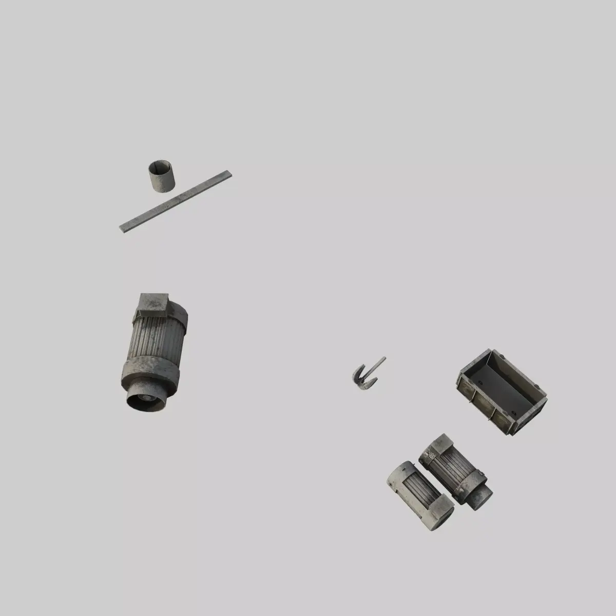 A realistic 3D asset pack of broken industrial motor components, ideal for factory environment detailing, simulation debris, or post-maintenance scene design. The set includes motor housings, coils, wiring debris, and metallic fragments, giving a highly authentic look to workshop or industrial layouts.