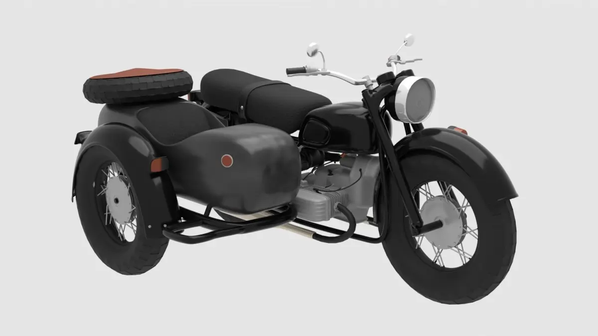 This 3D scene contains a classic motorcycle with a sidecar, reflecting retro style and high detail. Here is a detailed description of each element:
