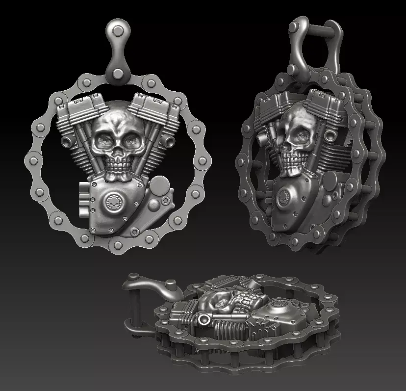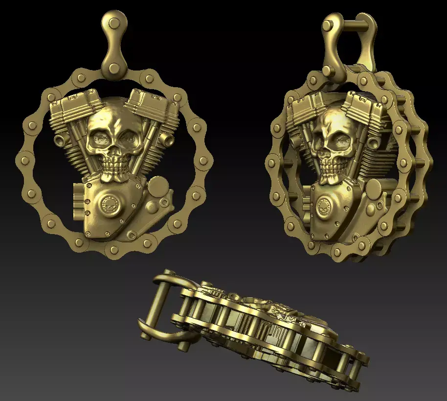 High-detail 3D model of a motorcycle engine combined with a skull motif, designed for professional jewelry production, CNC engraving, and 3D printing.The piece captures the raw spirit of biker culture with a detailed mechanical engine and aggressive skull centerpiece, framed by a motorcycle chain border.