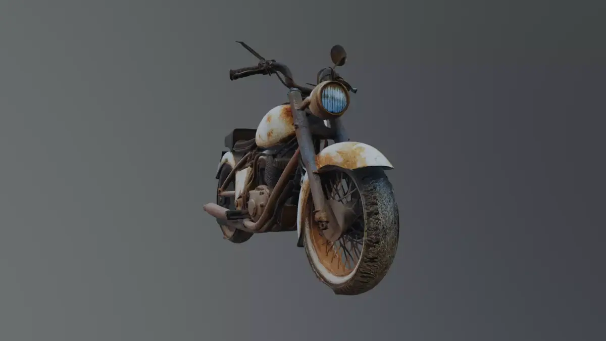 vintage motorcycle model featuring a classic frame design with visible engine components and worn, rusted surfaces. The asset emphasizes age and realism with weathered metal, chipped paint, and authentic proportions, making it ideal for post-apocalyptic, historical, or abandoned environment scenes. Suitable as a prop for streets, garages, or cinematic setup