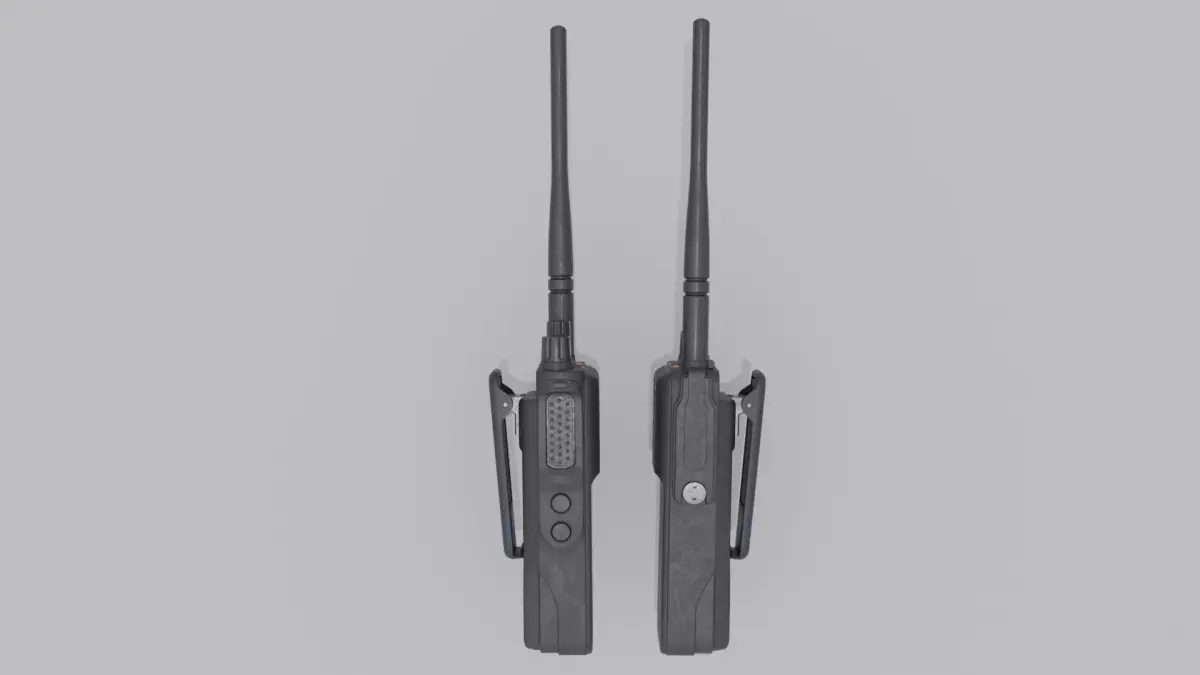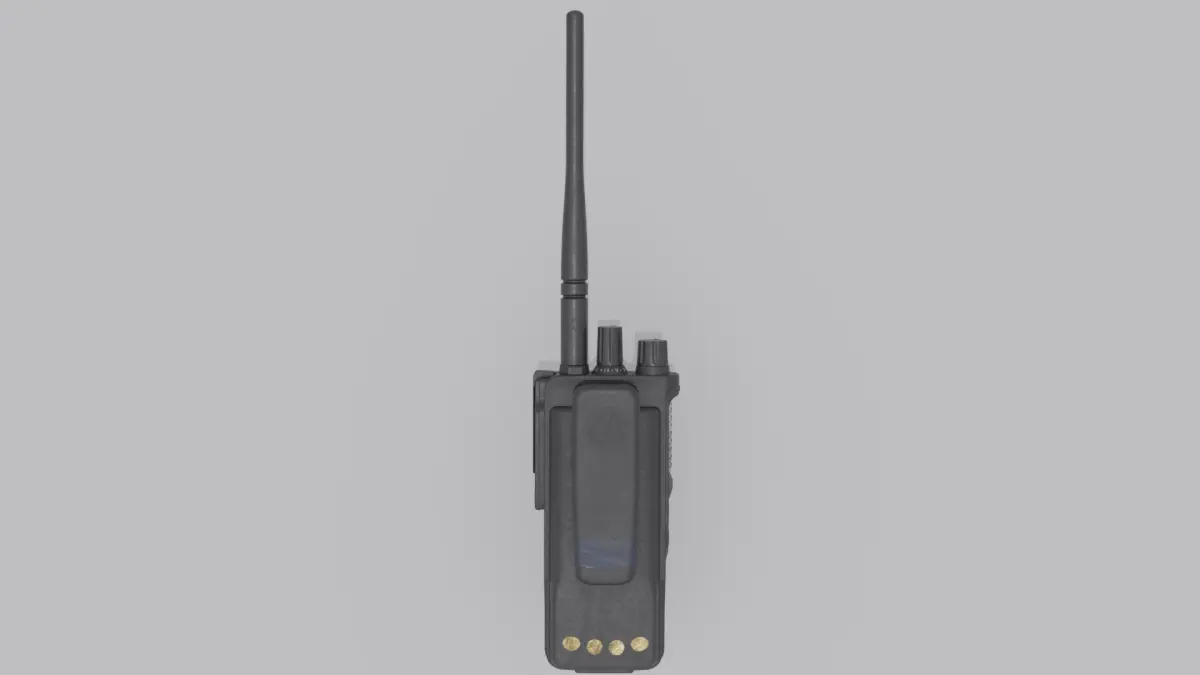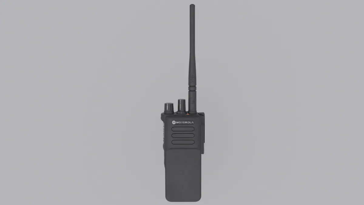 3D model of a Motorola DP4400e. The model includes elements such as the antenna, volume/channel knobs, front speaker grill, side buttons, and IMPRES battery contacts.
