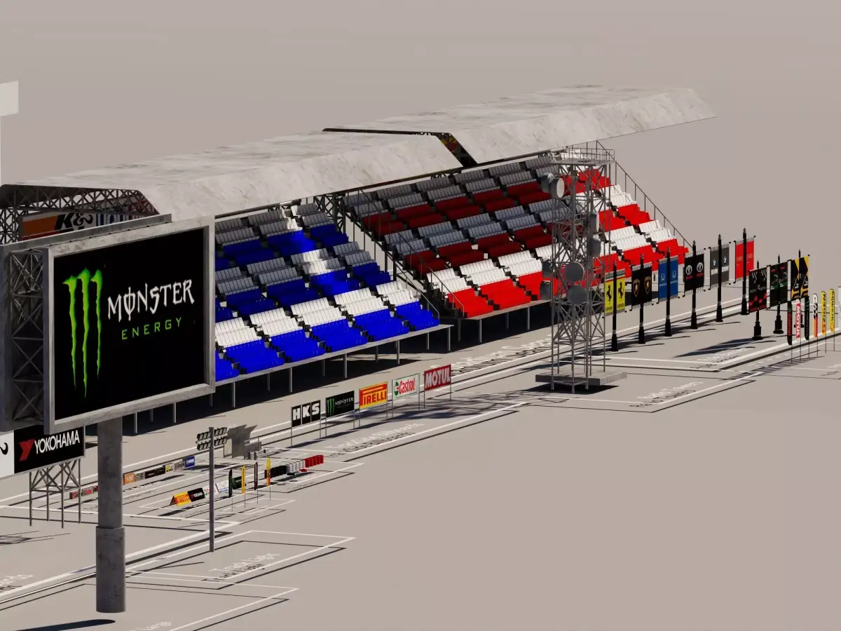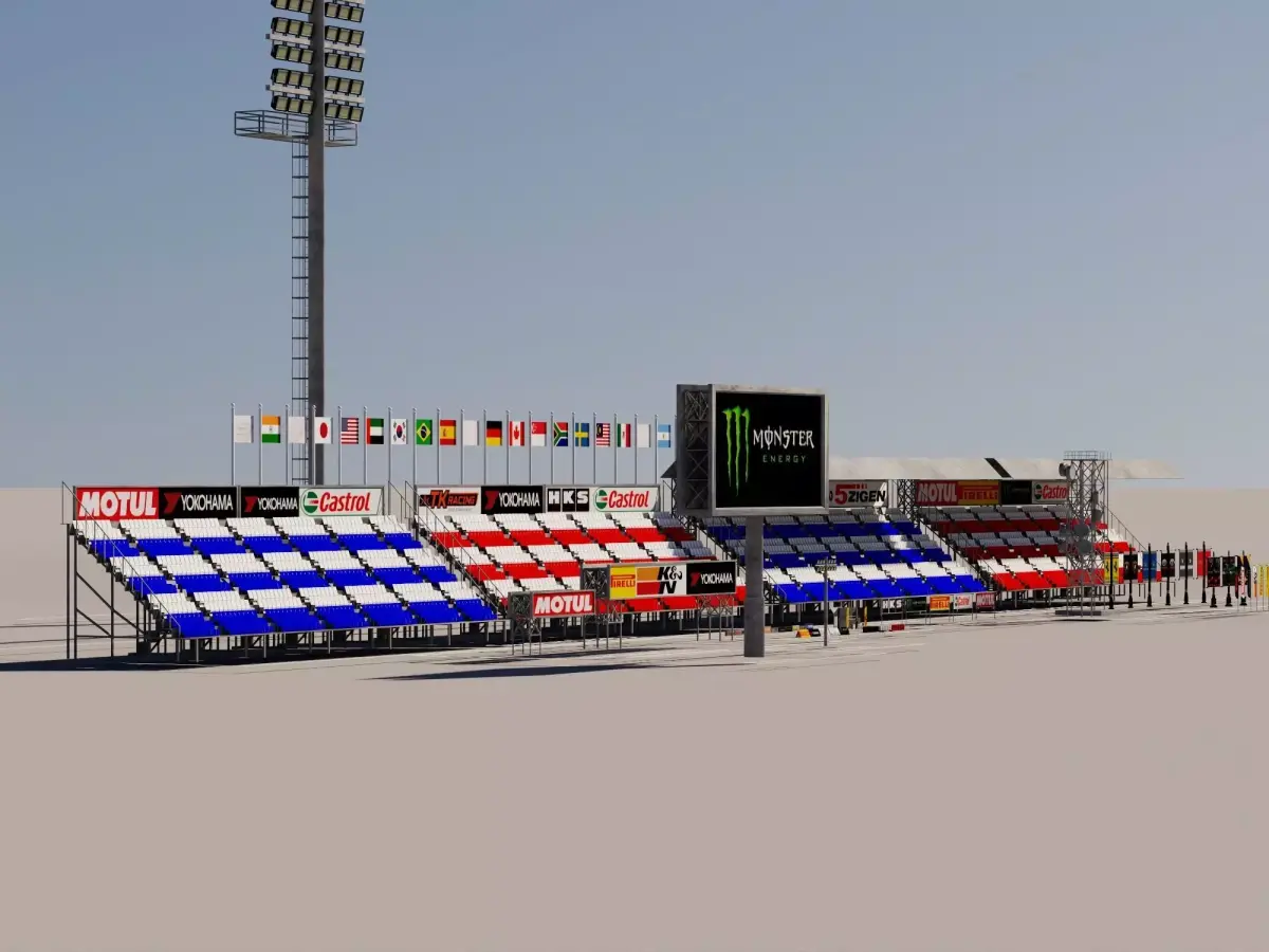 This detailed 3D model captures a vibrant motorsport grandstand, featuring multi-tiered seating in patriotic blue, white, and red colors, accommodating spectators for racing events. It includes realistic elements such as international flags (representing countries like India, Japan, USA, Korea, Brazil, Germany, Canada, South Africa, Sweden, and Argentina), prominent advertising banners from brands like MOTUL, YOKOHAMA, Castrol, TK Racing, HKS, ZIEGEN, Pirelli, K&N, and a large Monster Energy digital screen. A tall floodlight tower, pit lane barriers, and structural supports add to the authenticity. Perfect for game development, virtual racing simulations, architectural visualizations, or motorsport-themed projects. The model is optimized with high-quality textures for seats, banners, and metallic elements. File formats: OBJ, FBX, Blender.