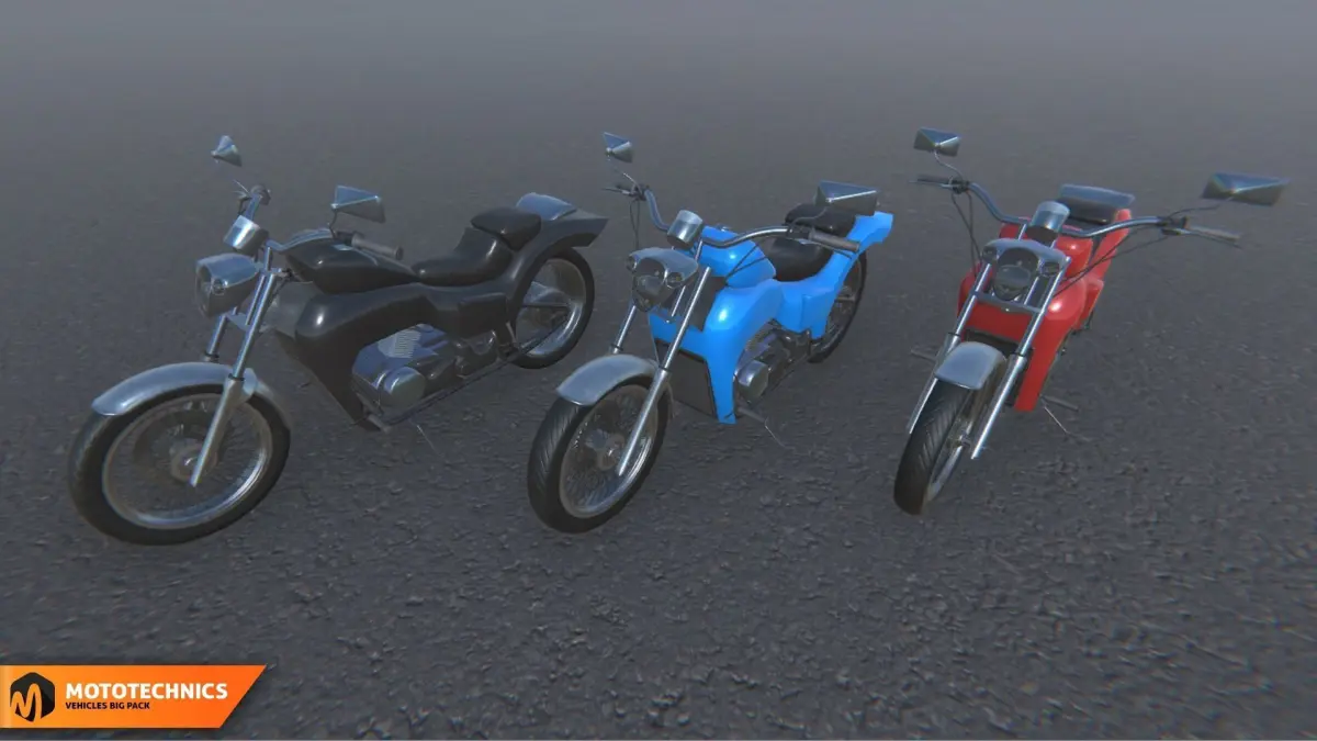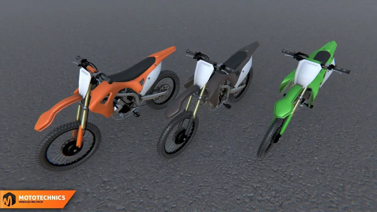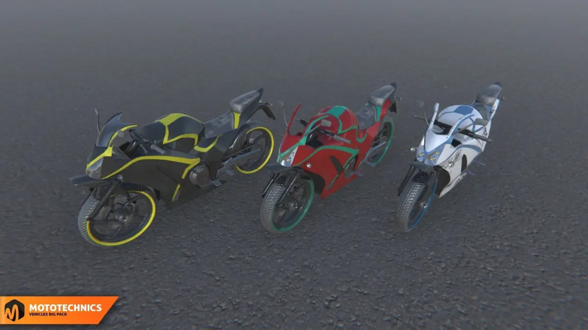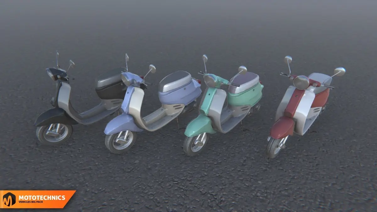 Mixaill studio presents a good solution for your games, VR projects and simulators.Mototechnics - vehicles big pack with 10 different vehicles.Number of textures: 197Texture dimensions: 256 x 256, 512 x 512, 2048x2048, 4096x4096Polygon count ofAtv: 65.1K TrisAuto rickshaw: 32.5K TrisBuggy: 68.7K TrisGolf car: 32.3K TrisMoped_1: 32K TrisMoped_2: 37.6K TrisMotorcycle: 59.5K TrisMotorcycle cross: 81.1K TrisMotorcycle sport: 49.8K TrisScooter: 34.4K Tris