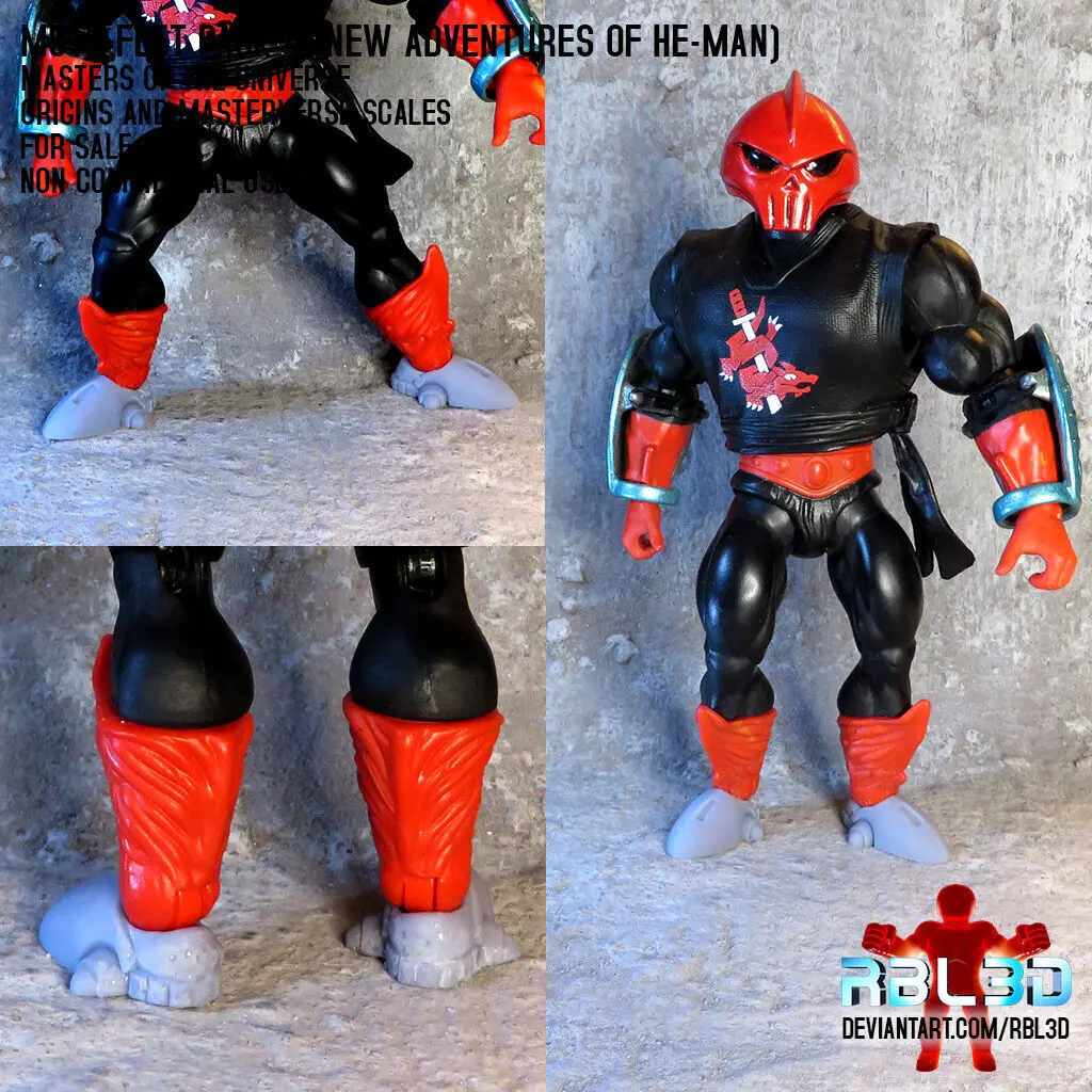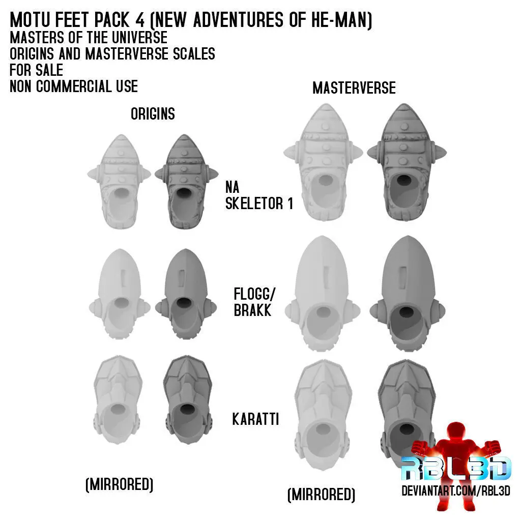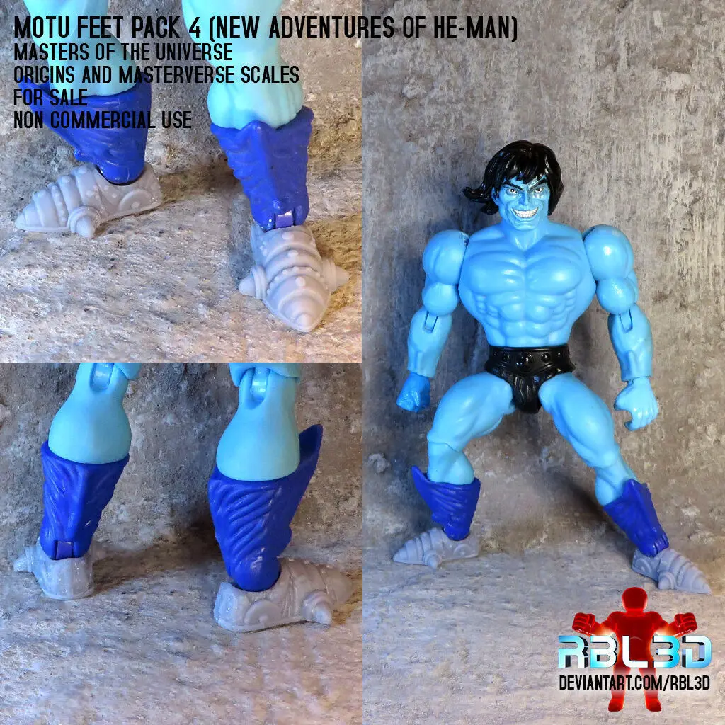This is the fourth pack of feet for Motu Origins and Mastersverse.The main reason for this foot pack is the Reptilax figure that Mattel presented for the Origins collection. Due to a policy of mold reuse, some figures don't fully respect their original design and in the case of Reptilax the feet should be the same as the first Skeletor from New Adventures of He-man. To close the 3-pack I added the Flogg/Brakk's and Karatti's feet out of a mix of similarity and personal preference.