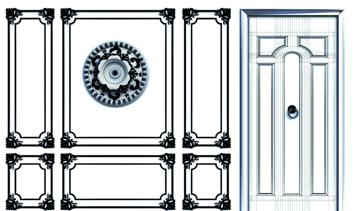 A collection of decorative plaster mouldings placed in the centre of the ceiling, mouldings on the walls, 3D model on door handles .All elements are adapted for use separately.All elements are presented in the picture of the wall. The framed door is inserted into the wall for ease of use.Corona Materials: Plastics Acrylic Opaque White and Aluminium Brushed Distorted. No any textures.Scene Statistic below:Polygons: 9115818 Verticles: 6567192Scale of all details (100,100,100)Model has real-world scale and is centered at 0,0,0All pivots in placeMaterials, objects and textures have the correct namesNo cleaning up necessary, just drop your models into the scene and start renderingPlease don't forget to rate the model, for us it is very important :)
