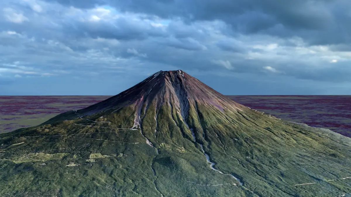 First of all, as far as I'm concerned Mount Fuji crater does not accumulate a mass of water, but I really liked the looks of it ;) This is a triangulated mesh model, fully scaled, georeferenced in UTM projected coordinates and generated with controlled precision to ensure proportions integrity. This means that one can take measurements and perform spatial analysis with an high degree of confidence (below metric precision). The model was developed in metric system, with and approximated area of 15000ha/38600ac, 18km/11mi along the main diagonals, 2700 meters of height difference between top and surroundings. Native format (.obj) plus (.mtl) and (.jpeg) base texture. The scene was rendered on blender and all the elements you see on thumbnails are included on model package (DEM exception). In blender scene objects were reduced to 1/10 its original size and brought close to origin to improve hardware performance, but (.obj) file will show original scale and georeference. From the main triangulated mesh I developed the DIGITAL ELEVATION MODEL AND THIS IS NOT INCLUDED ON THIS PACKAGE. If you have interest on the color coded relief check out my other published model Mount Fuji Landscape plus Digital Elevation Model. Feel free to contact me if you have any doubts about the model or if you want a similar model from a different location. PLEASE READ DESCRIPTION AND CHECK THUMBNAILS TO EVALUATE PACKAGE CONTENT BEFORE BUYING.