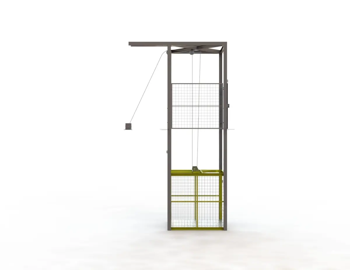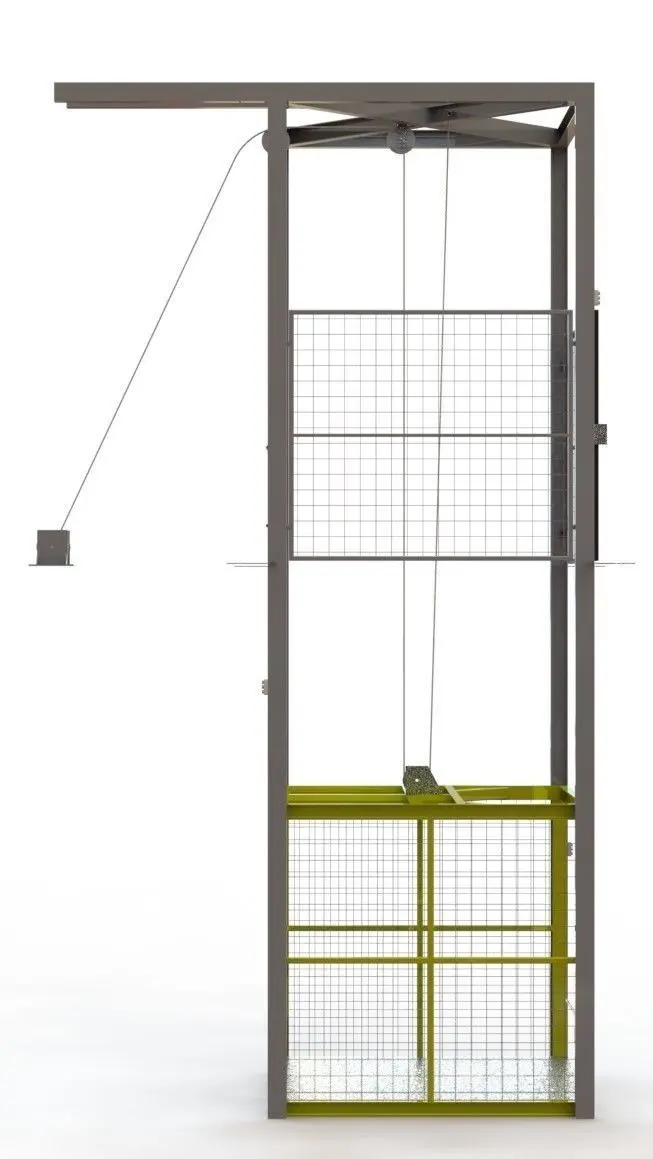 The Mount - Load with geral dimensions: 6600x2795x3700 mm was installed inside an industrial building with the objective of transporting up to 1200 Kg of goods that the customer wanted to the upper floor.