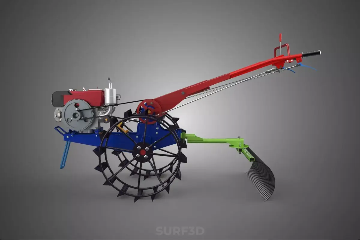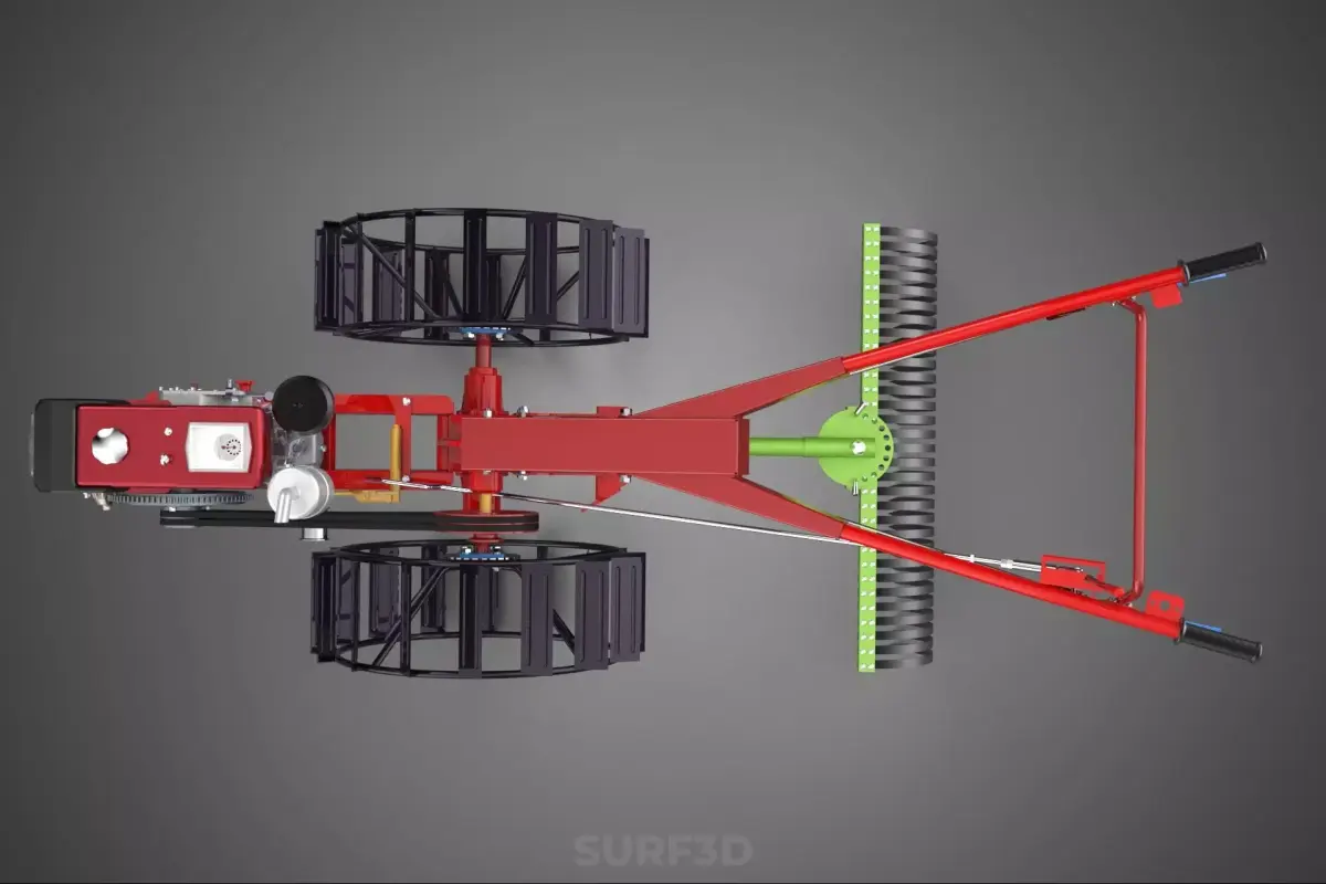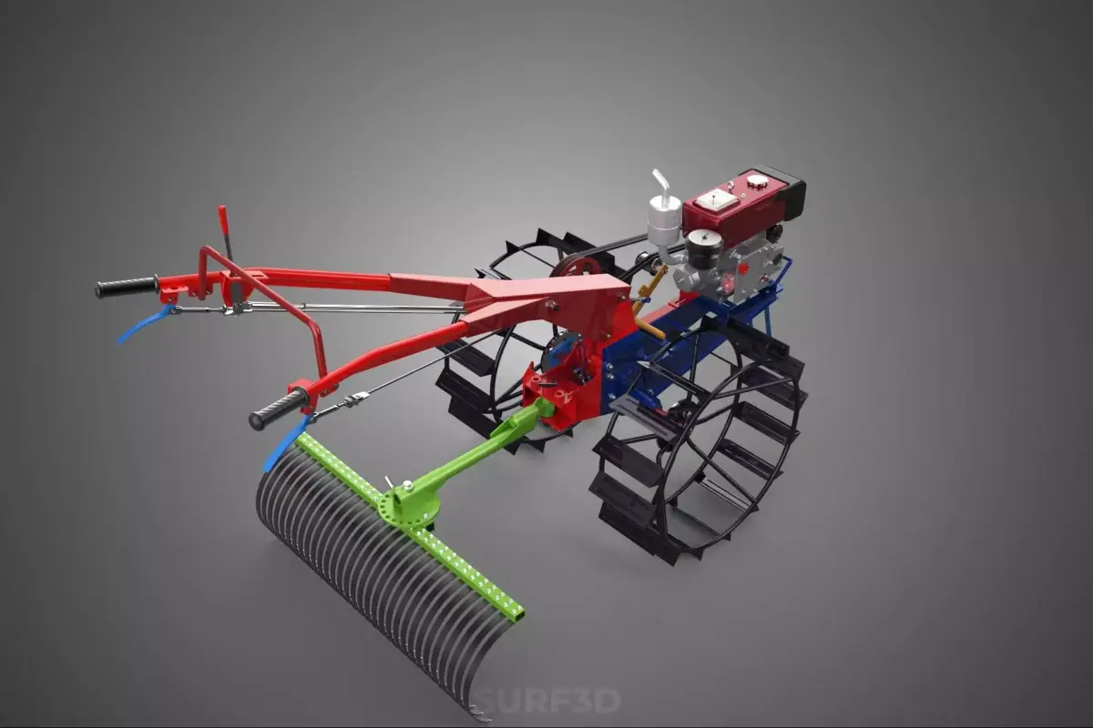 KEYWORDS: Walk-behind Tractor, Power Tiller, Harrowing, Raking, Cage Wheel, Seedbed Preparation, Agricultural Machinery, Two-Wheel Tractor, Soil Cultivation, Shallow Tillage, Residue Management, Ground Engagement, Flotation, Traction, PTO Attachment, Finishing Tool, Soil Pulverization, Clod Breaking, Leveling, Hand Tractor, Intensive Farming, Organic Farming, Gardening, Farm Implement, Tine Harrow, Secondary Tillage, Axle Drive, Inter-row Cultivation, Vegetable Farming, Soil Aeration.