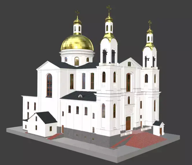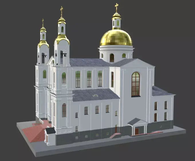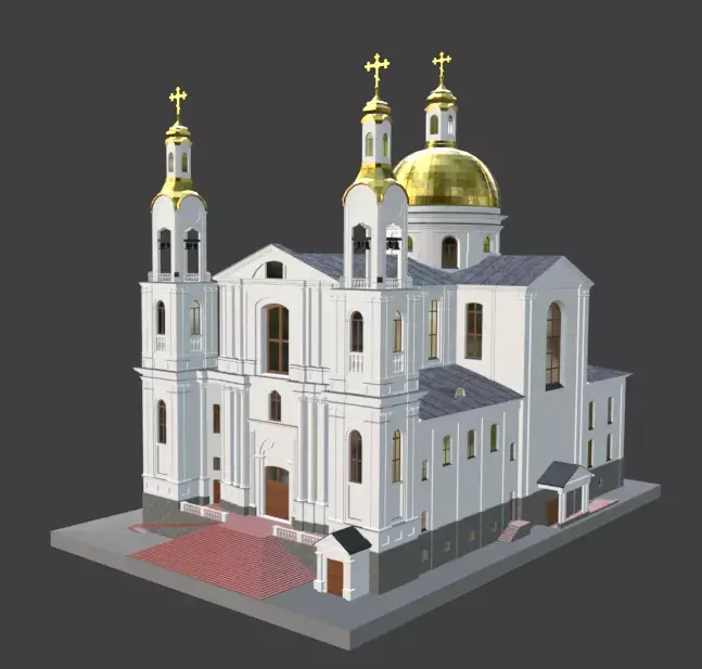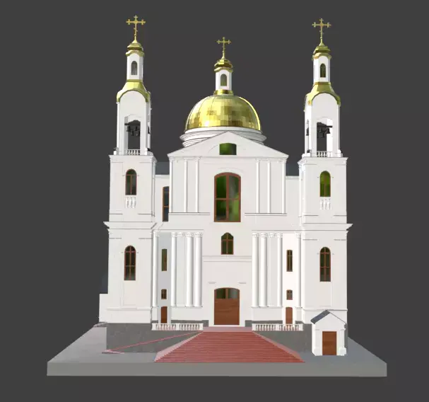 This highly detailed 3D model depicts an Eastern Orthodox cathedral perched atop a mountain monastery, inspired by Byzantine and Slavic architecture. Featuring three golden onion domes, ornate arched windows, and a grand entrance with columned portico, the structure is ideal for historical visualization, fantasy environments, or architectural renders.