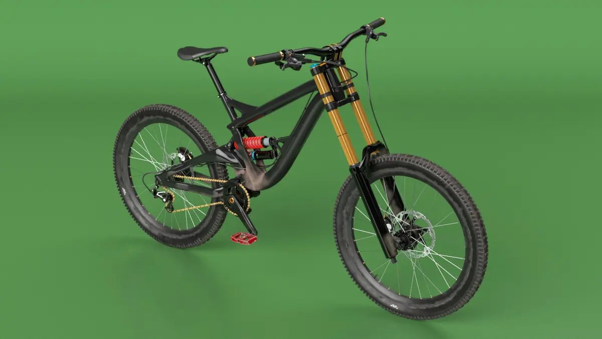Designed with a sturdy frame and equipped with front and rear suspension systems, this bike ensures superior shock absorption and control on uneven trails. It features high-performance tires, disc brakes for reliable stopping power, and ergonomic handlebars for enhanced maneuverability. The intricate detailing highlights the chain mechanism, suspension components, and aerodynamic design, offering a realistic representation suitable for various applications.