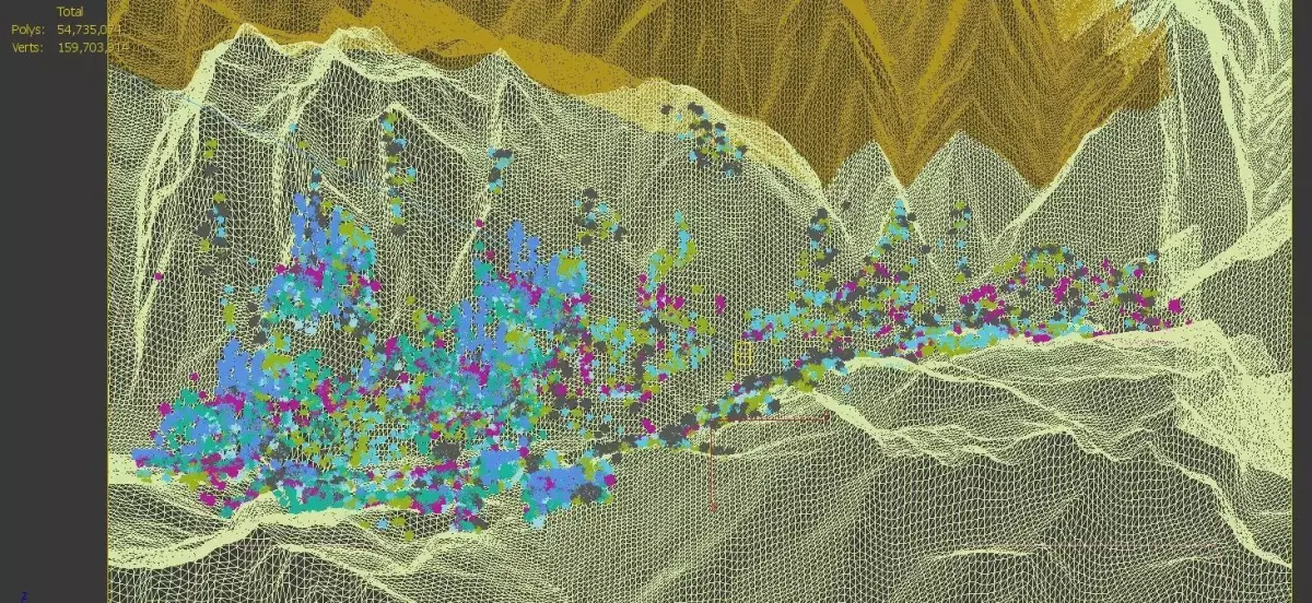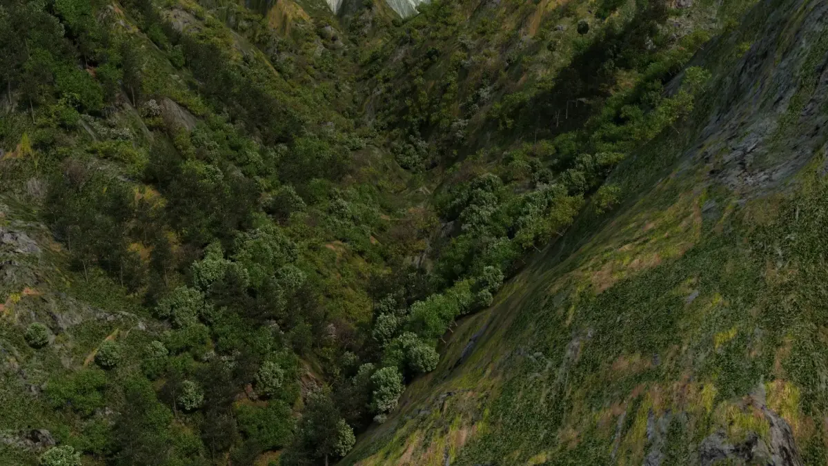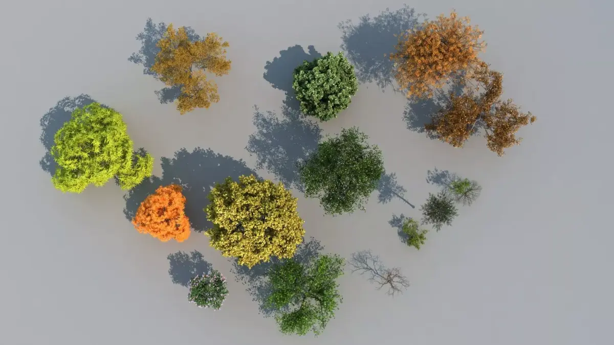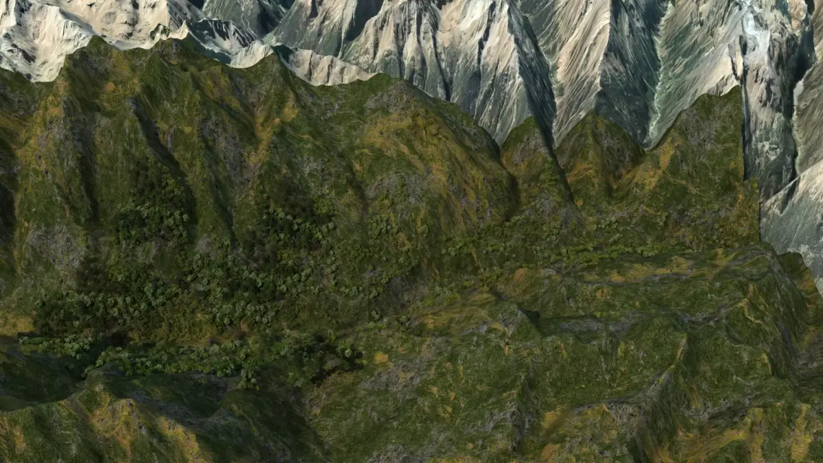 Mountain landscape with snowy peaks and trees. Vrmesh trees (13 files).