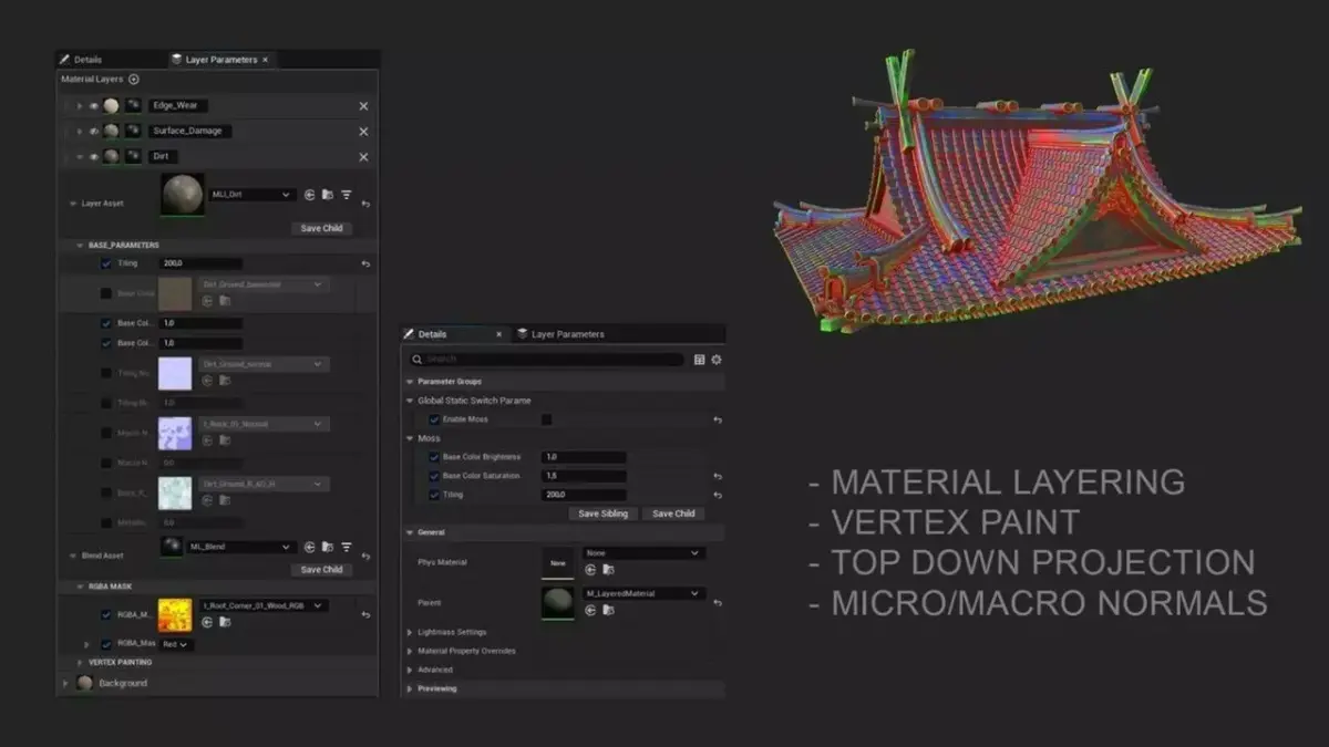 - Apply dirt, moss, or weathering dynamically across assets