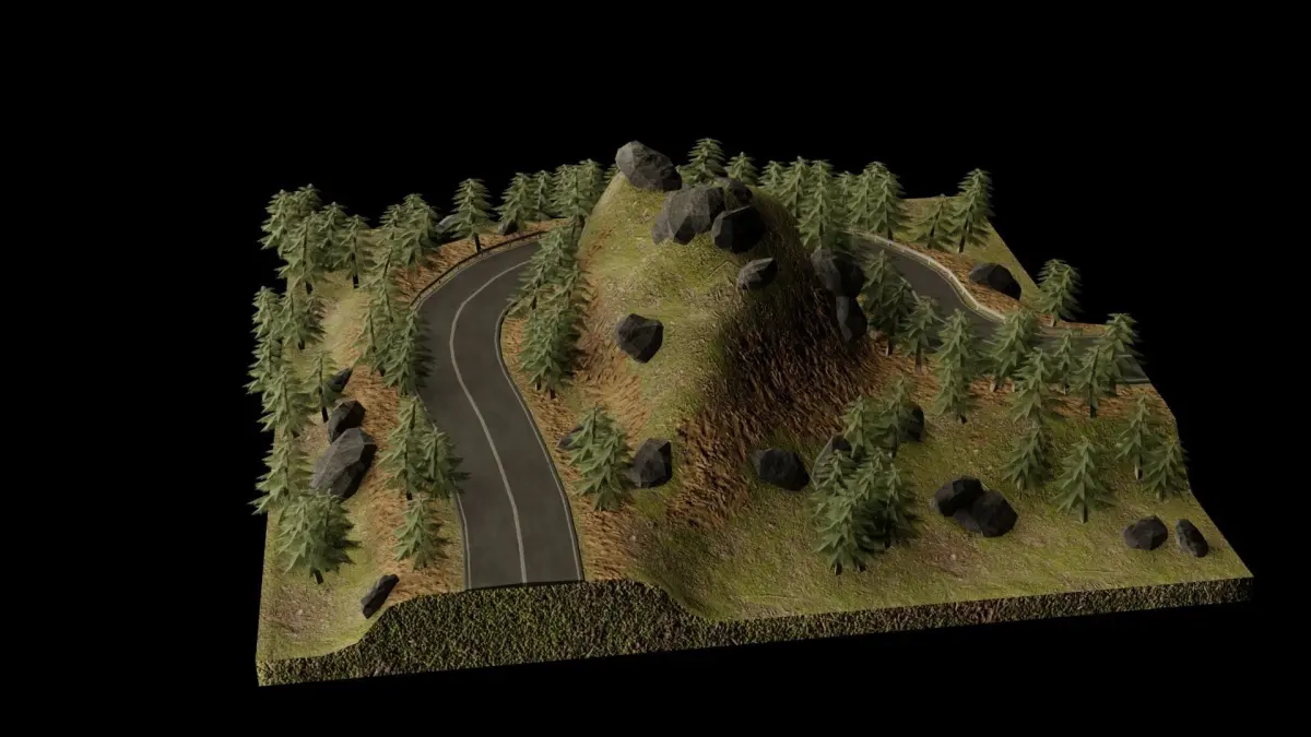 This is a 3D environment of a mountainous road. It can be used to render any objects in this mini 3D environment.
