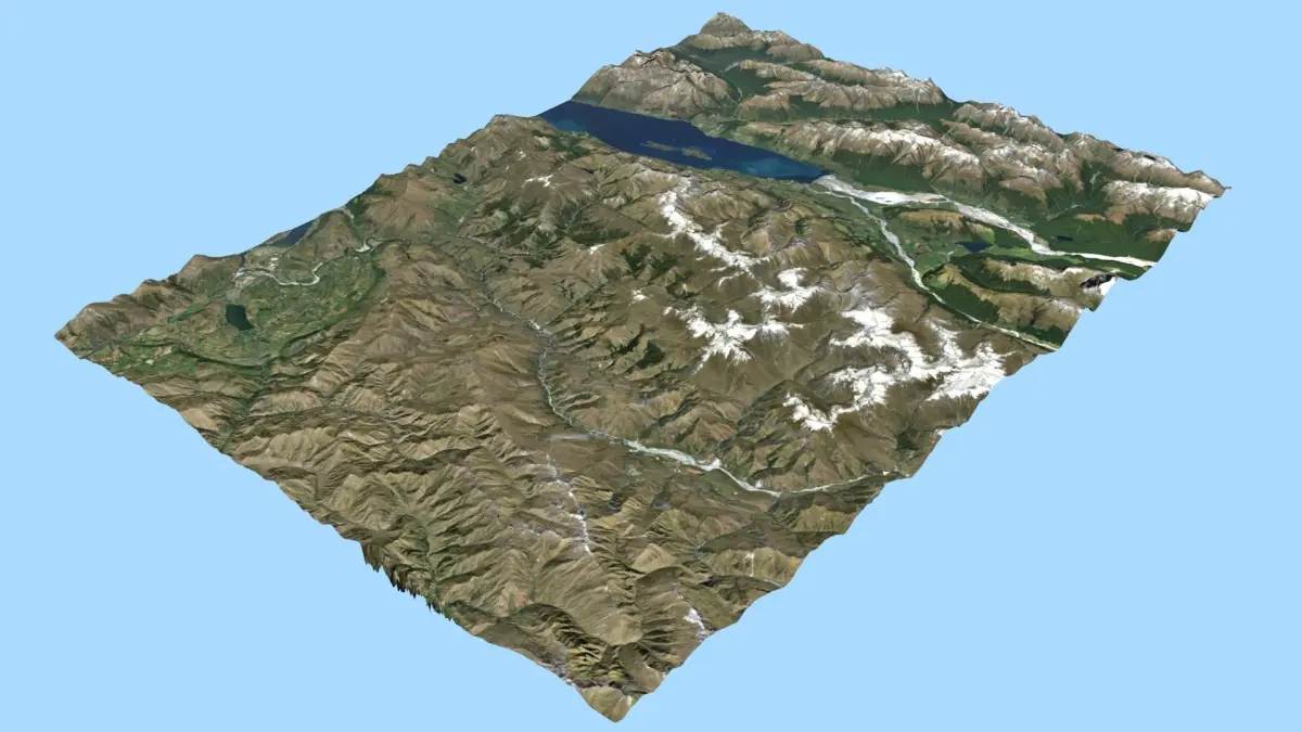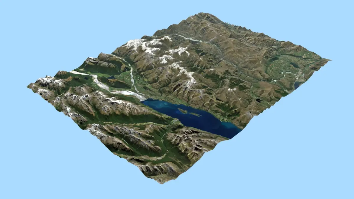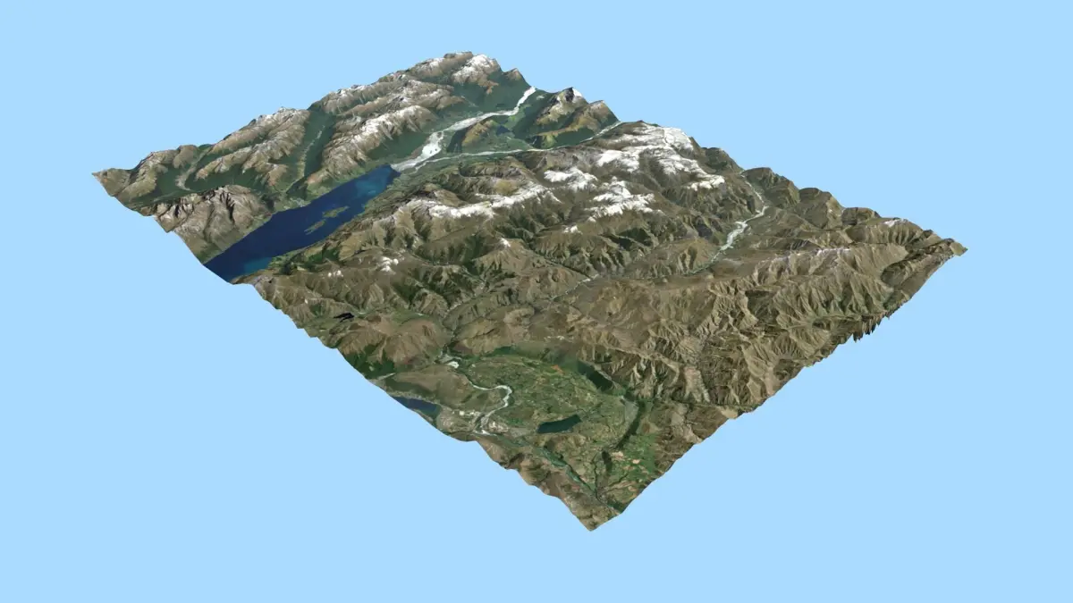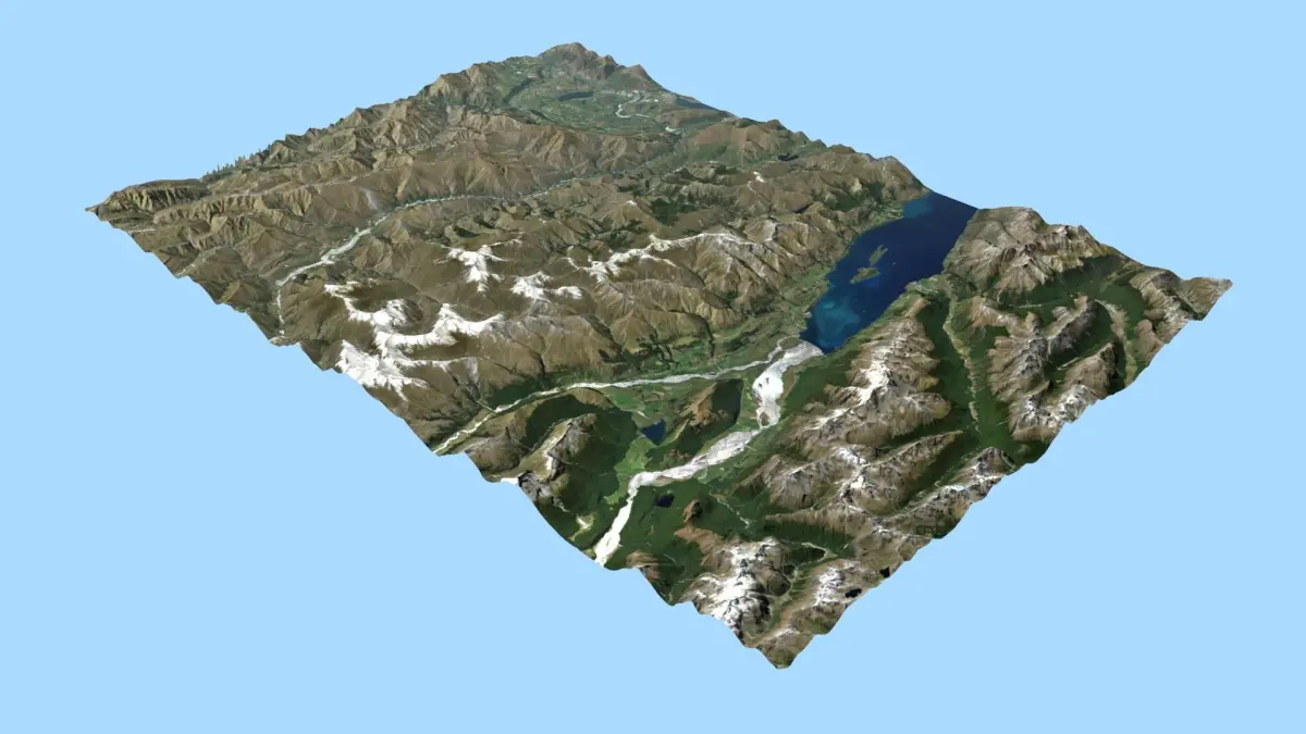 Mountains landscape based on Glenorchy in South Island, New Zealand. The terrain texture is a high resolution 34000 x 24000 px image. Included also is a low-resolution image of the same texture.