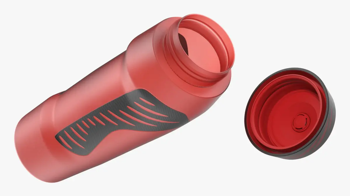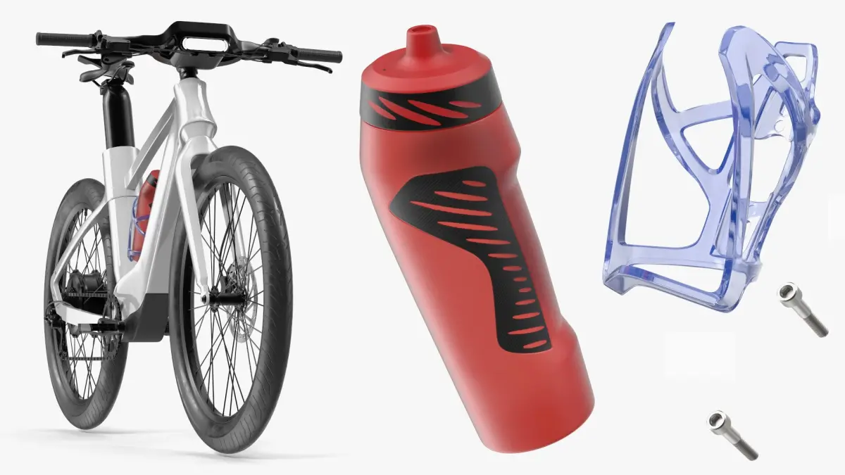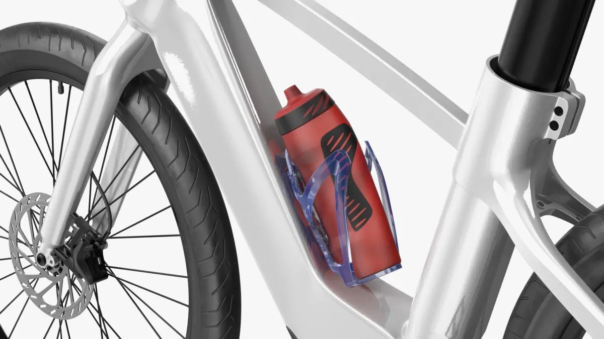 Mounted Bottle Cage with Sport Bottle on Electric Bicycle Frame is a three-dimensional model of a hydration accessory integrated into an e-bike design, showcasing a compact sport bottle secured in a lightweight frame-mounted cage.