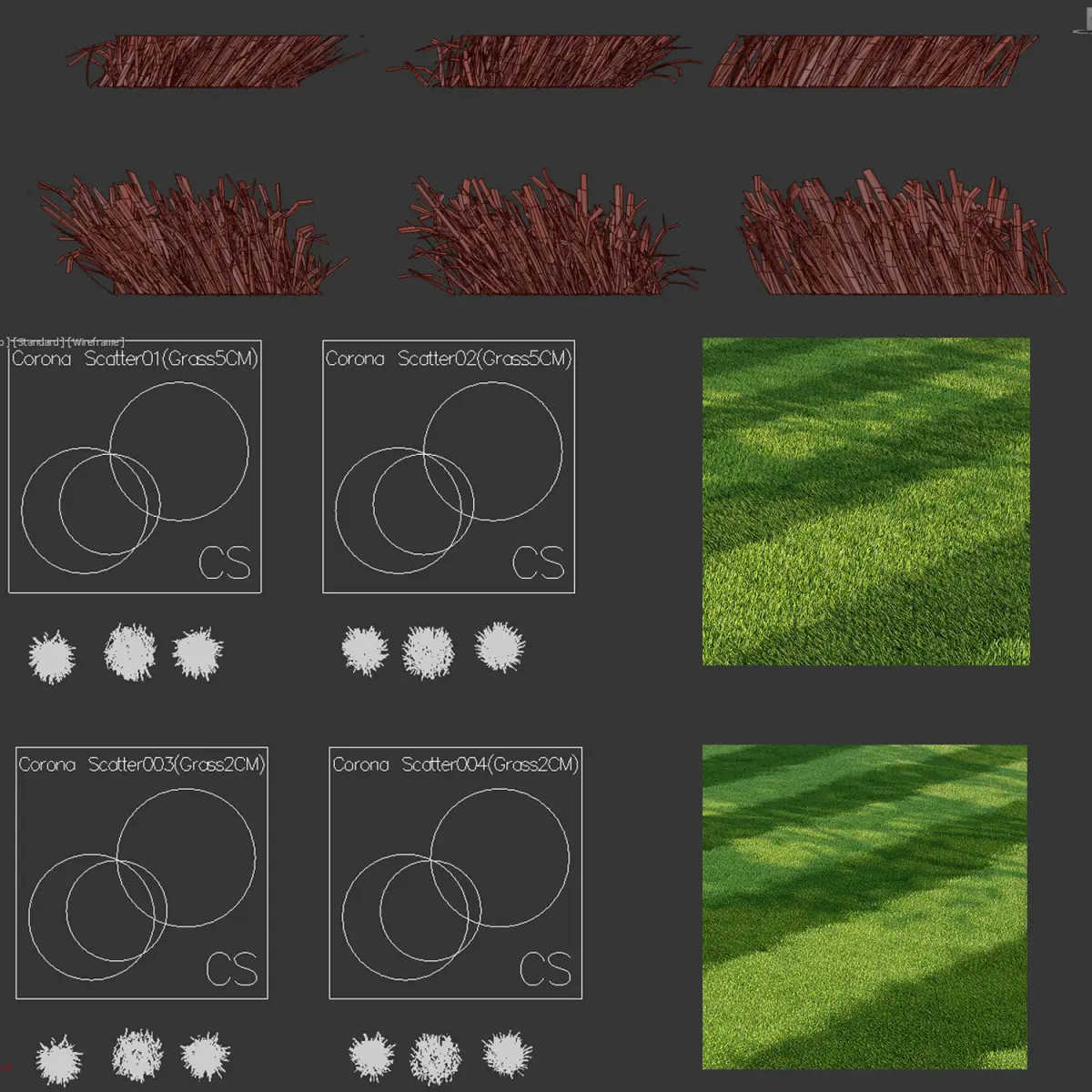 2 type of Mowed Lawn for Corona and vray render.With 2 types of Corona Scatter and choas scatter.